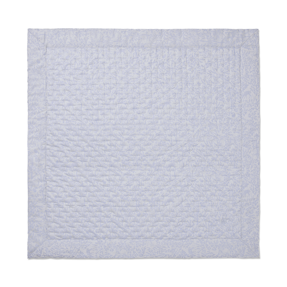 I Forest-kollektionen hittar du en quiltad filt i den blå färgen Clear Blue, där ett mönster av späda träd, hjortar och kaniner är invävda i tyget med en klassisk damastteknik. Filten är tillverkad i ekologisk bomull.
