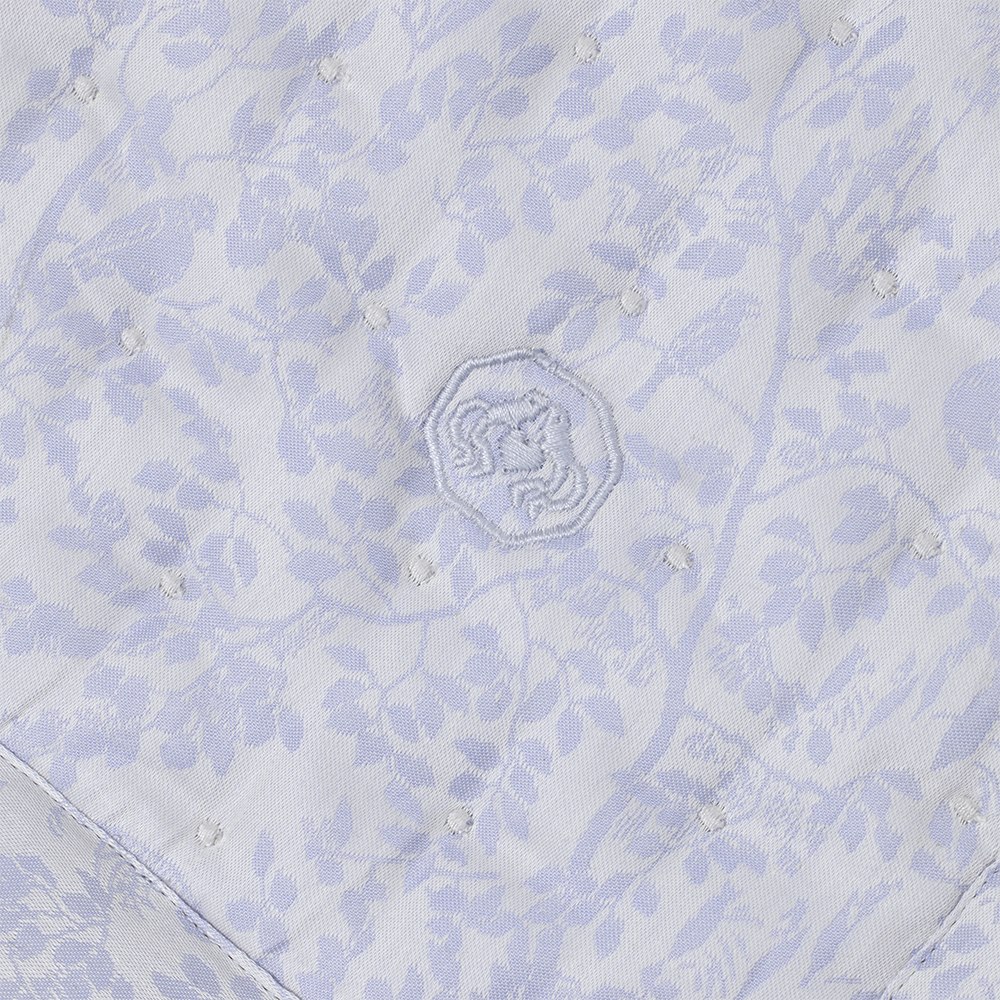 Alla produkter har broderats med Georg Jensen Damasks lilla barnlogotyp. Clear Blue är en ljus, lätt dämpad blå färg.