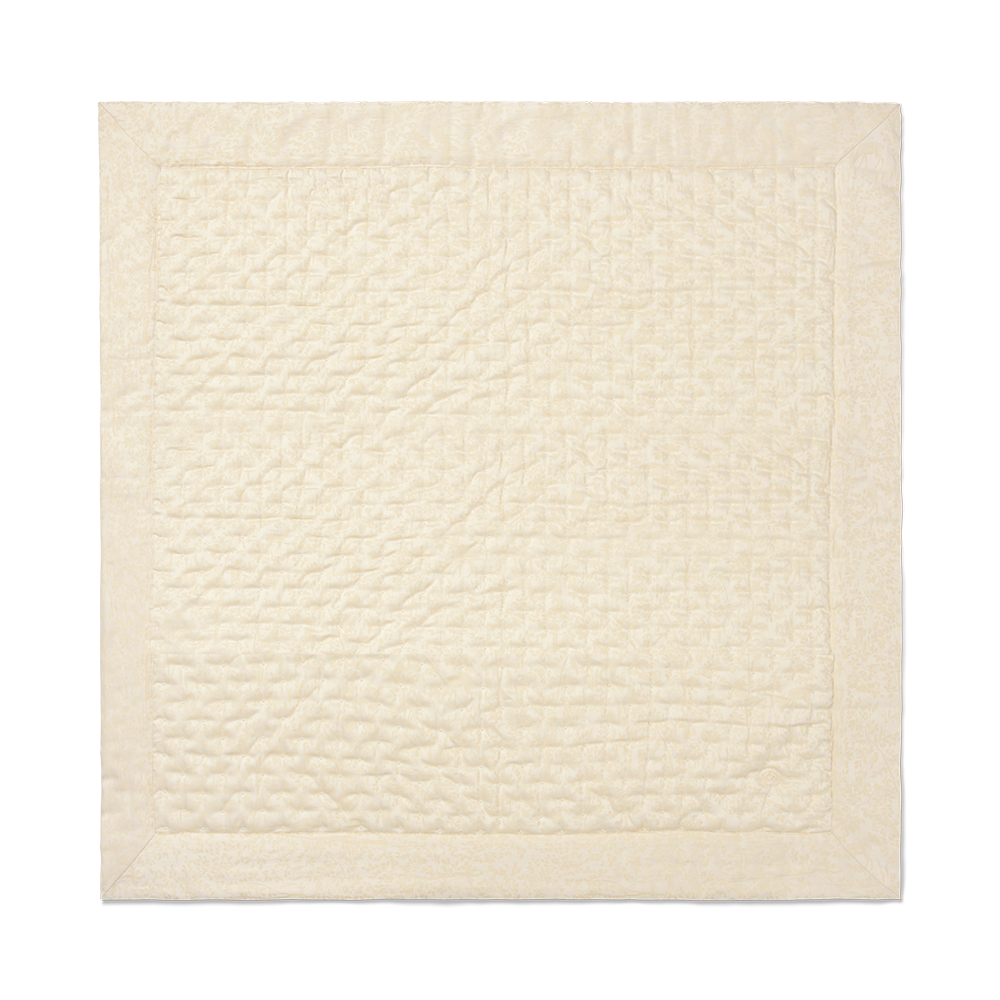 Den quiltade filten i färgen Misty Yellow är en del av den jaquardvävda Forest-kollektionen, där ett mönster av nyutslagna träd, hjortar och kaniner är invävda i tyget. Filten är tillverkad i ekologisk bomull.