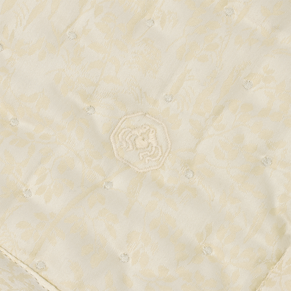 Alla produkter har broderats med Georg Jensen Damasks lilla barnlogotyp. Misty Yellow är en mild, blekgul färg.