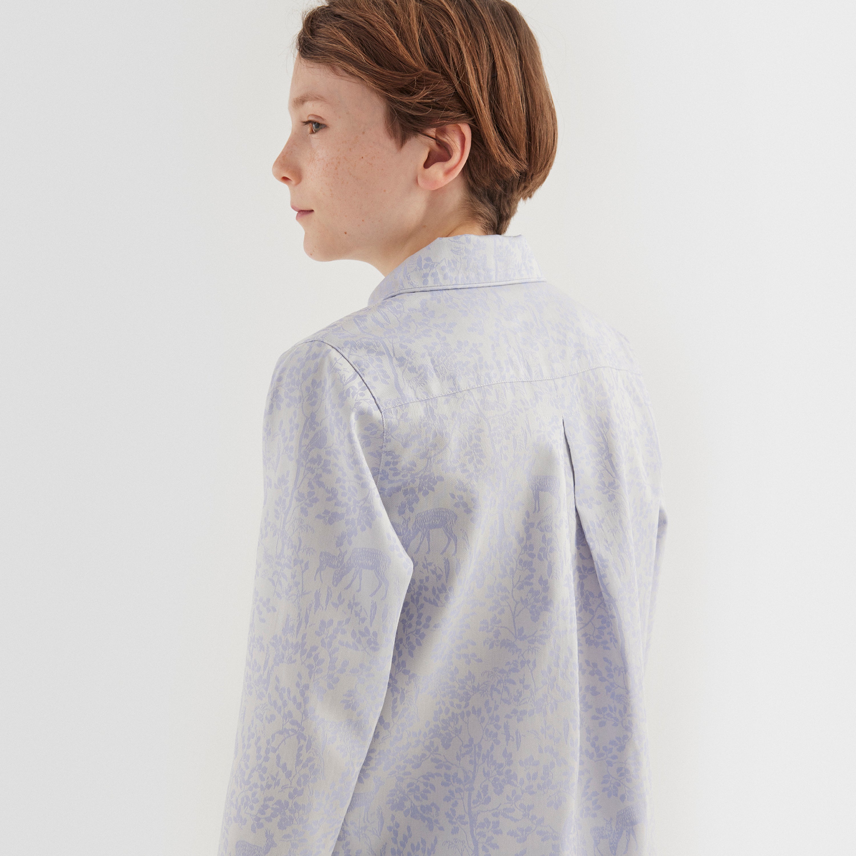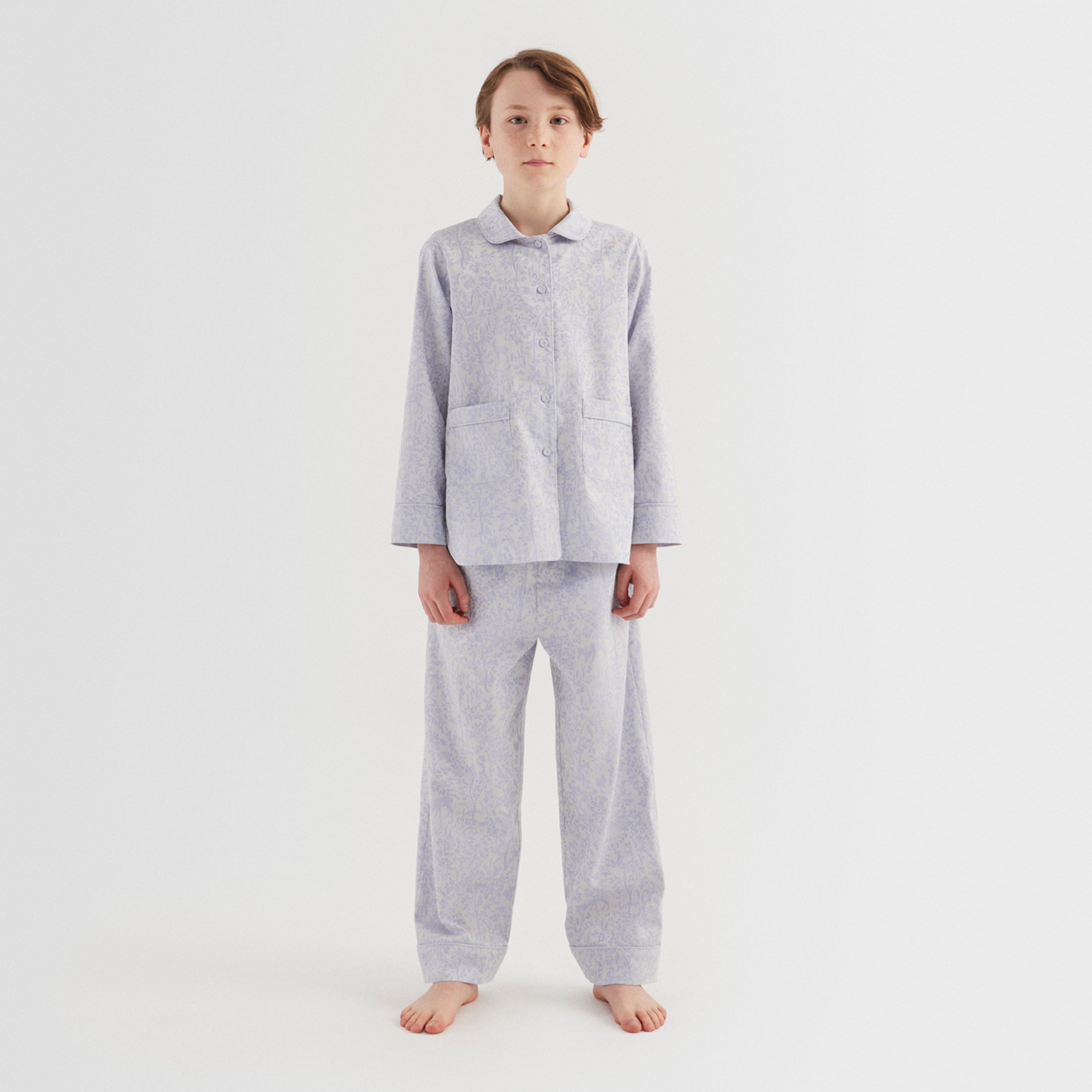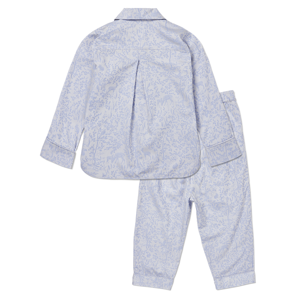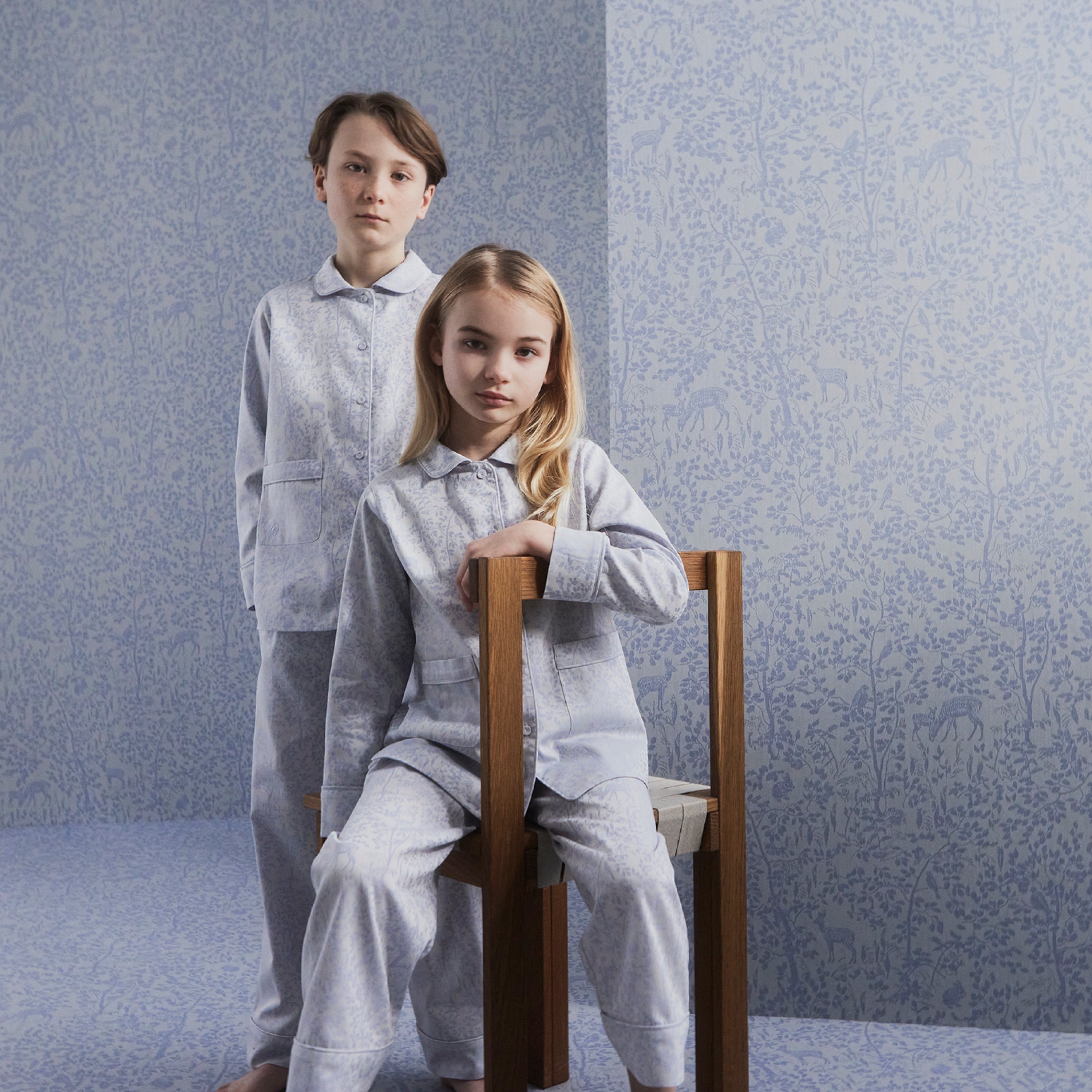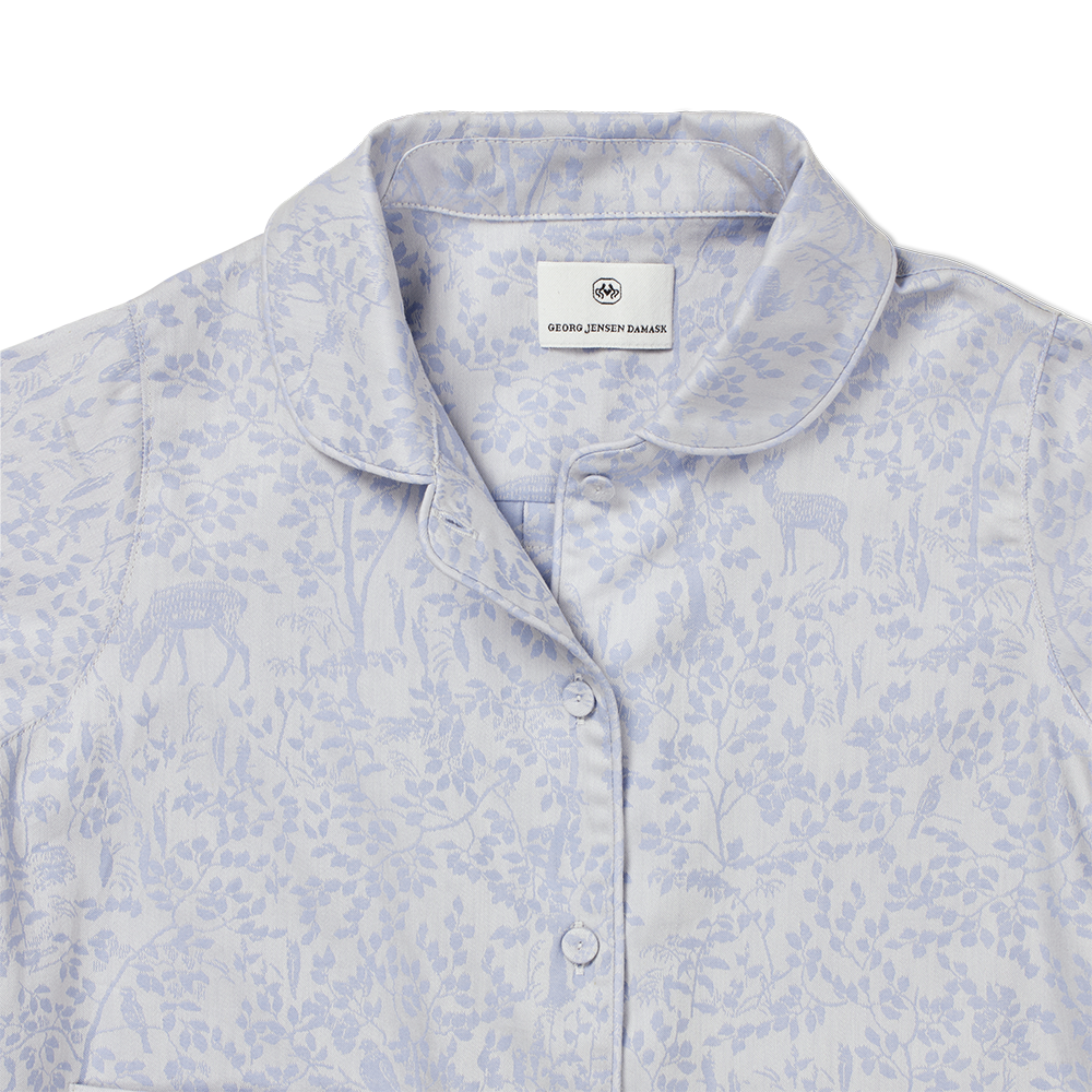 Pyjamasen i färgen Clear Blue är en del av den jacquardvävda barnkollektionen Forest. Pyjamassetet är tillverkat av ekologisk bomull och har Georg Jensen Damasks lilla barnlogotyp broderad på höger ficka.