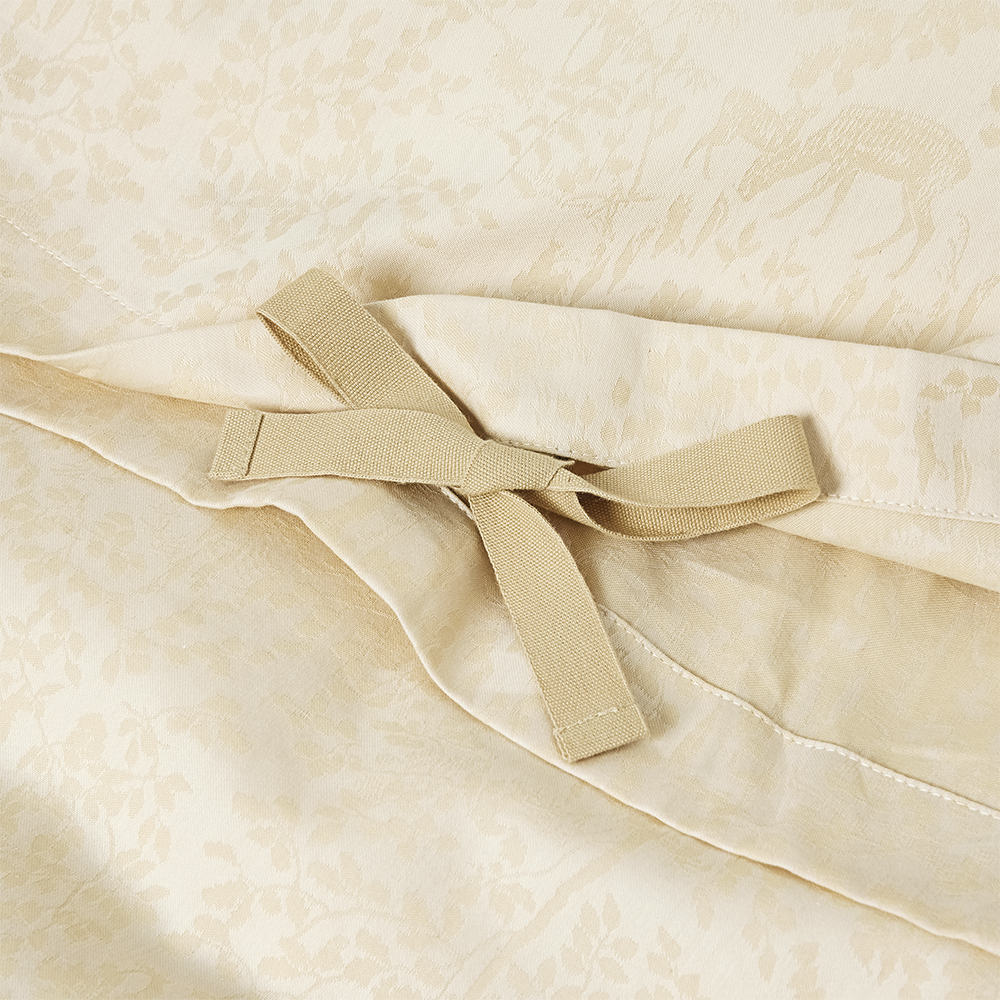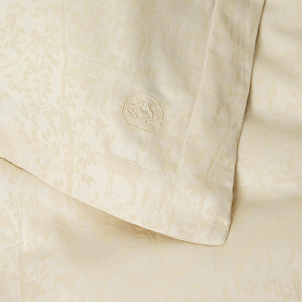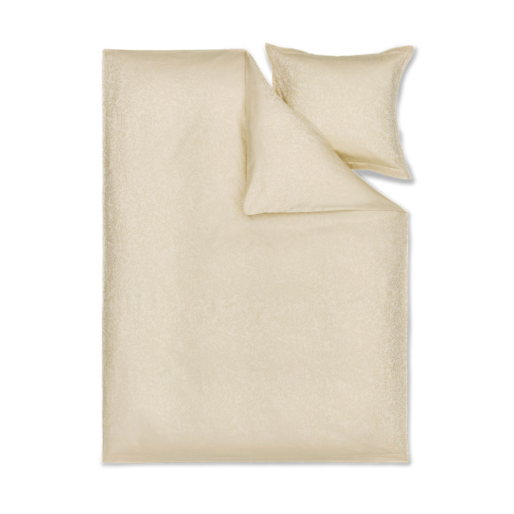 Bäddset ur Forest-kollektionen i ekologisk bomull i den ljusgula färgen Misty Yellow. Motivet i kollektionen Forest är hämtat från en gobeläng från 1800-talet som finns i Georg Jensens Damasks arkiv.