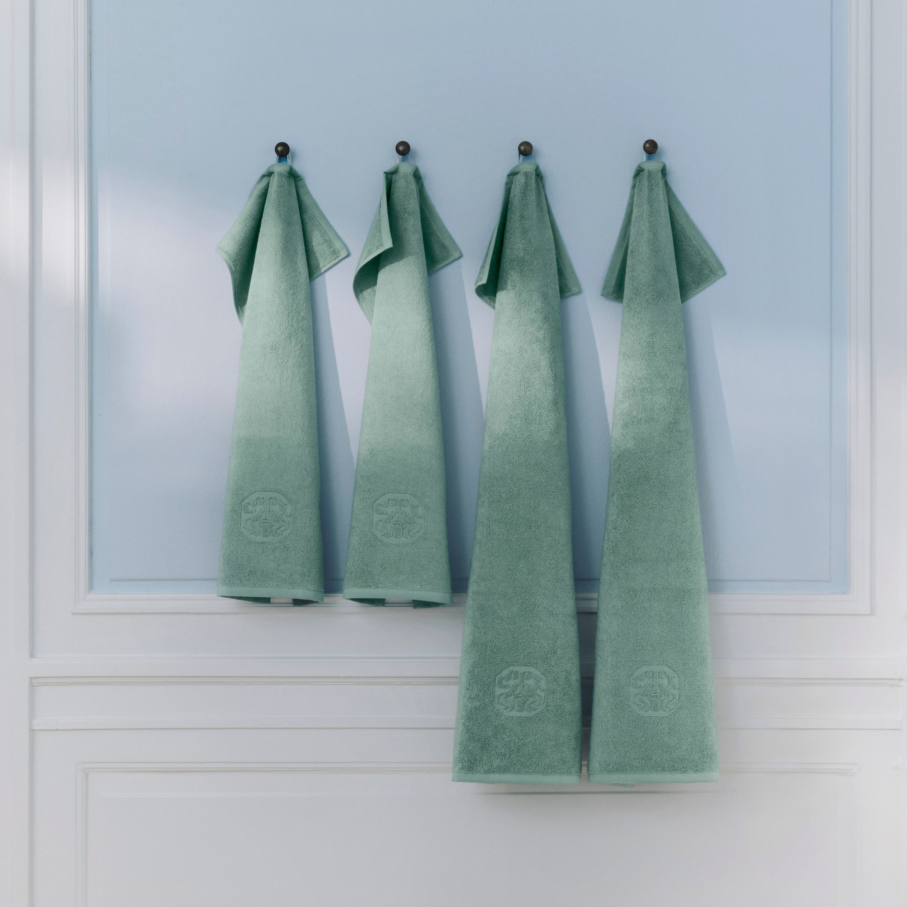 Damask Terry gästhandduken har ett enkelt uttryck med Georg Jensen Damasks ikoniska logotyp invävd som en elegant detalj. Sage Green är en kall nyans av grönt.