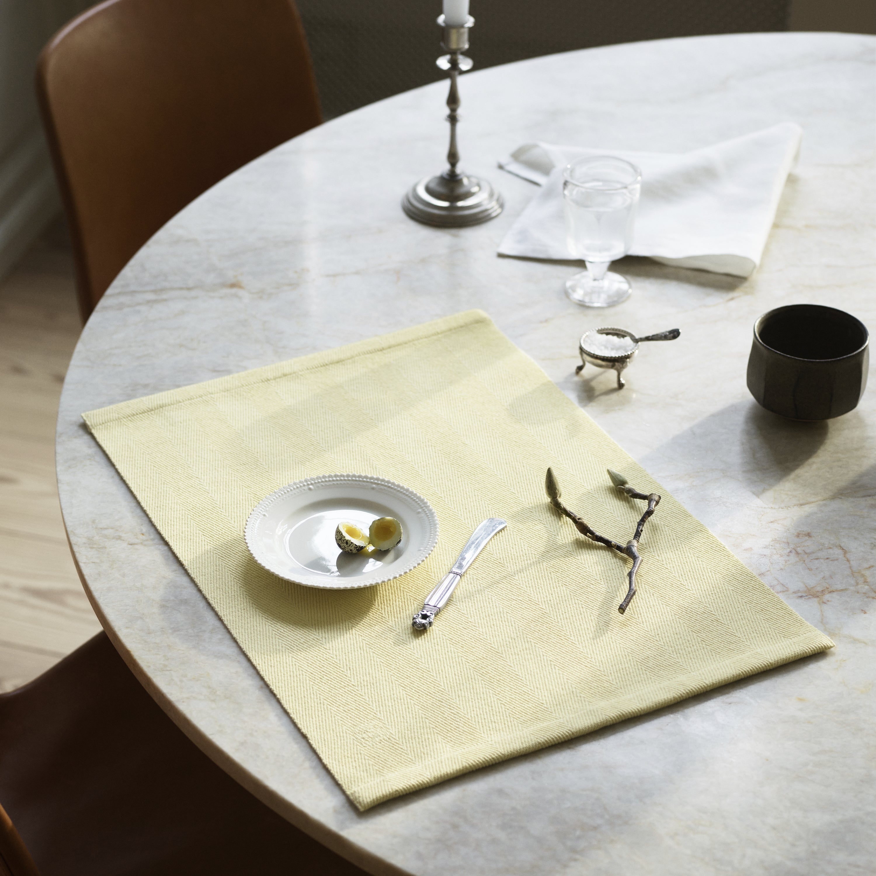 Herringbone är en kraftig bordstablett i fiskbensväv av 100 % bomull. Bordstabletten ligger stadigt på bordet och har en liten broderad Georg Jensen Damask-logo. Med den gula färgen Soft Yellow skiner solen ständigt i ditt kök.