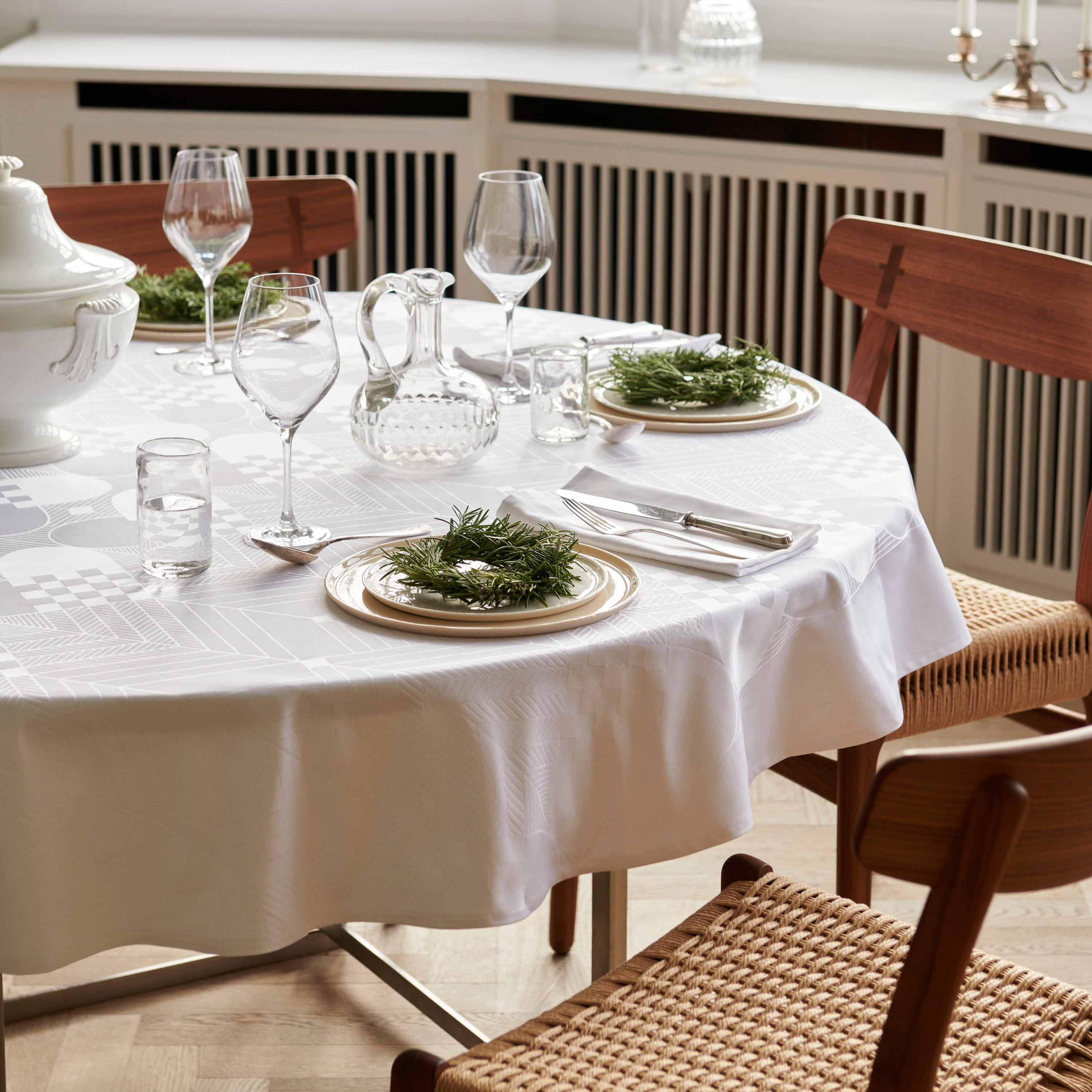I den vita varianten framträder det ikoniska mönstret mot en vacker snövit bakgrund som gör duken till ett tidlöst inslag i dukningen. En elegant duk som kan kombineras med pynt i många olika färger eller hållas helt klassisk och minimalistisk.
