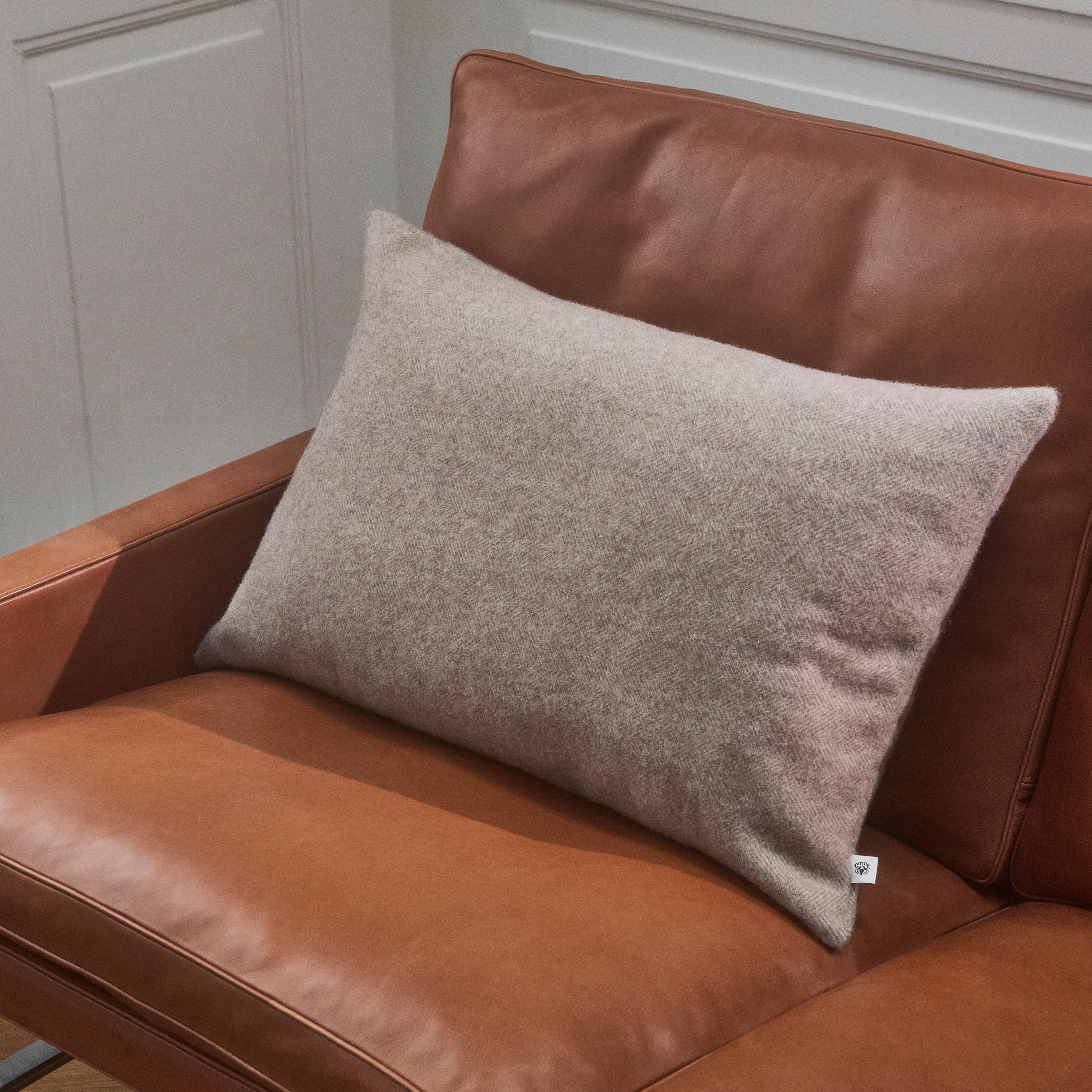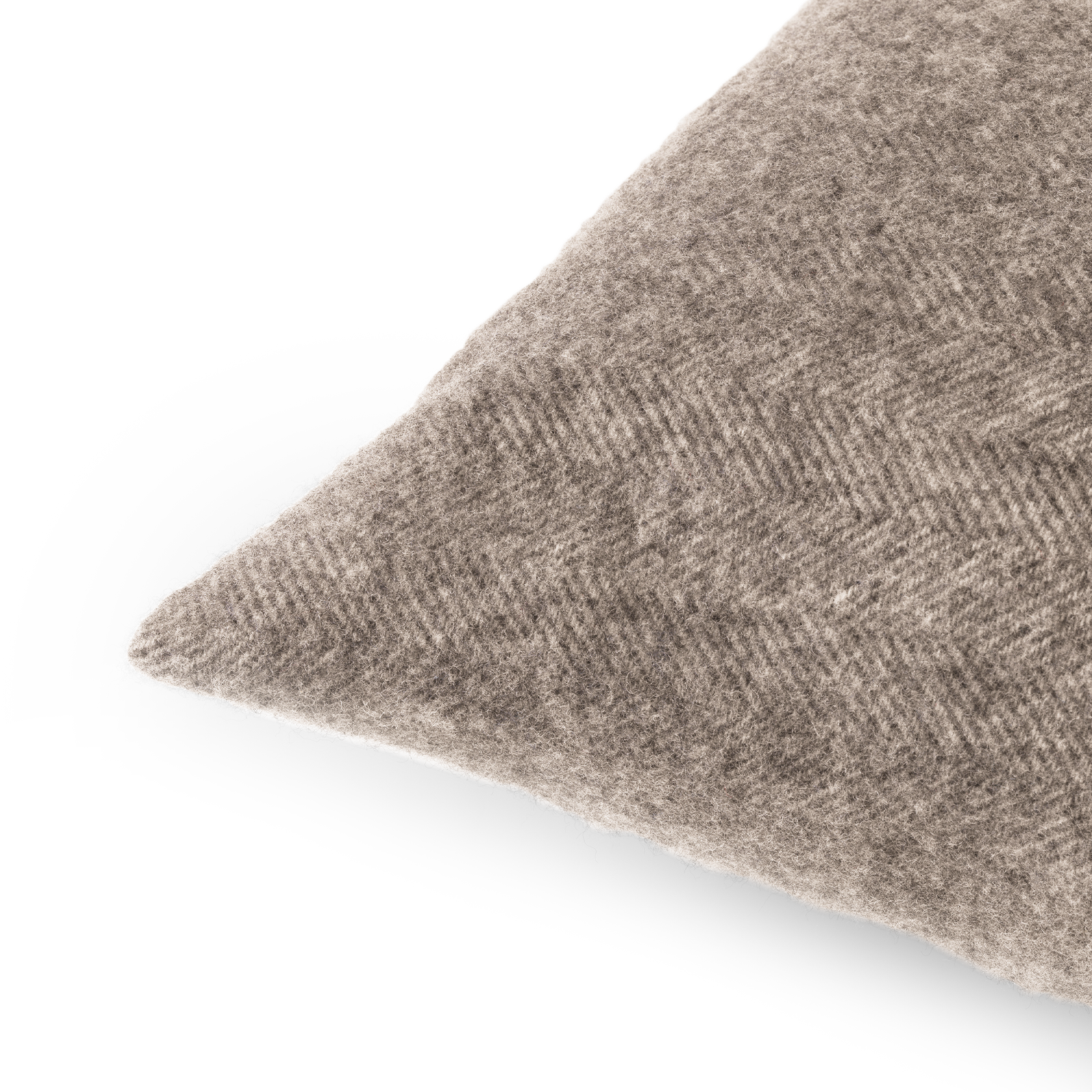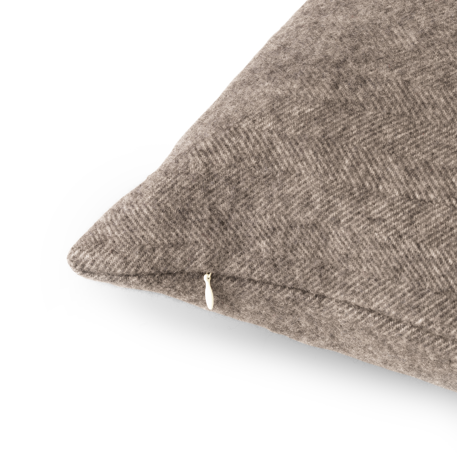 Elegant kudde i merinoull och kashmir. Drift-kudden i färgen Porcini Brown är vävd i ett raffinerat fiskbensmönster av garn i bruna och cremefärgade nyanser, vilket ger den ett vackert och naturligt uttryck. Drift-kudden är tillverkad av 90 % merinoull och 10 % kashmir, vilket gör att den behåller värmen väl och är perfekt att mysa med.