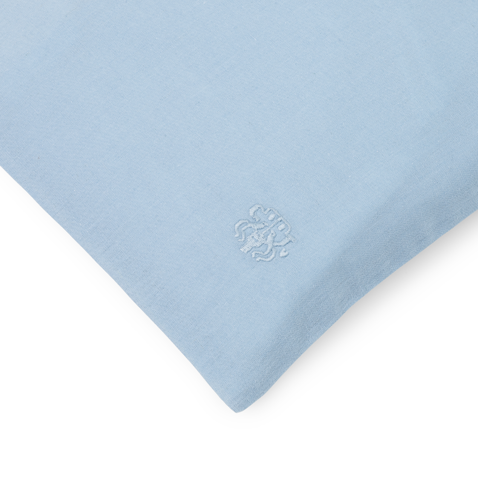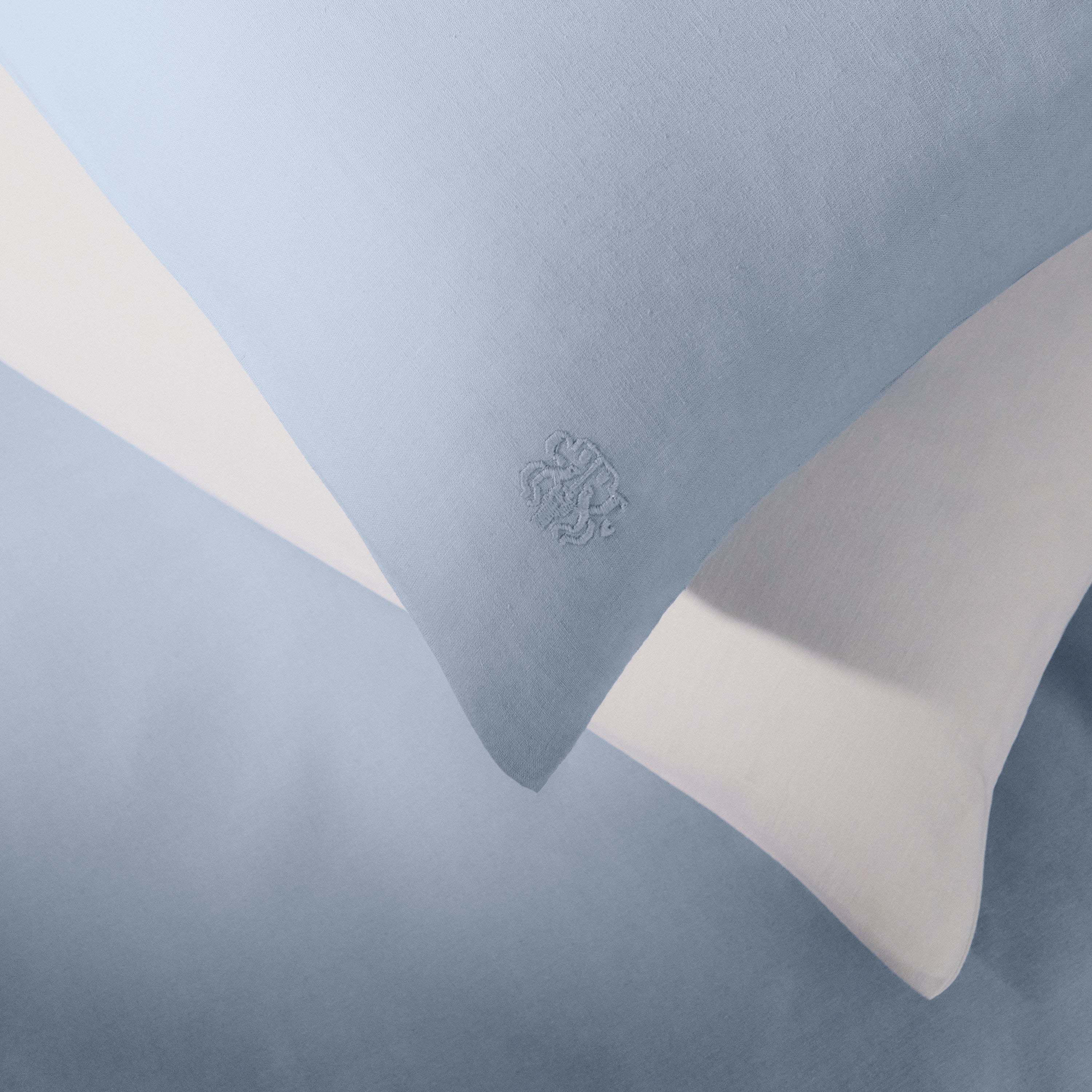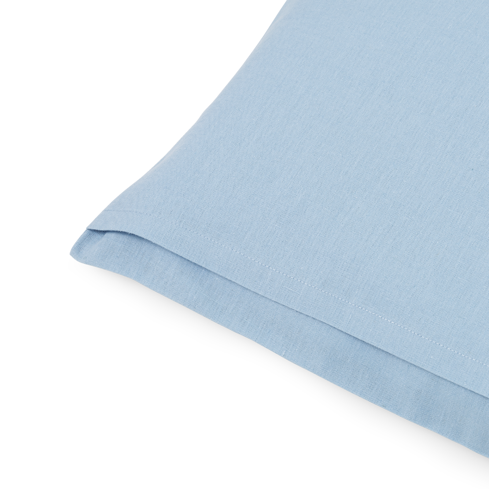 Even sängkläderna är vävda i linne och bomull för att förena de två materialens unika egenskaper. Linnets naturliga textur kombinerad med bomullens mjukhet och formstabilitet. Tillsammans ger det en vacker, matt och mjuk yta – samt andningsbara och slitstarka sängkläder. Färgen Blue Haze är en ljus och dämpad nyans av blått.