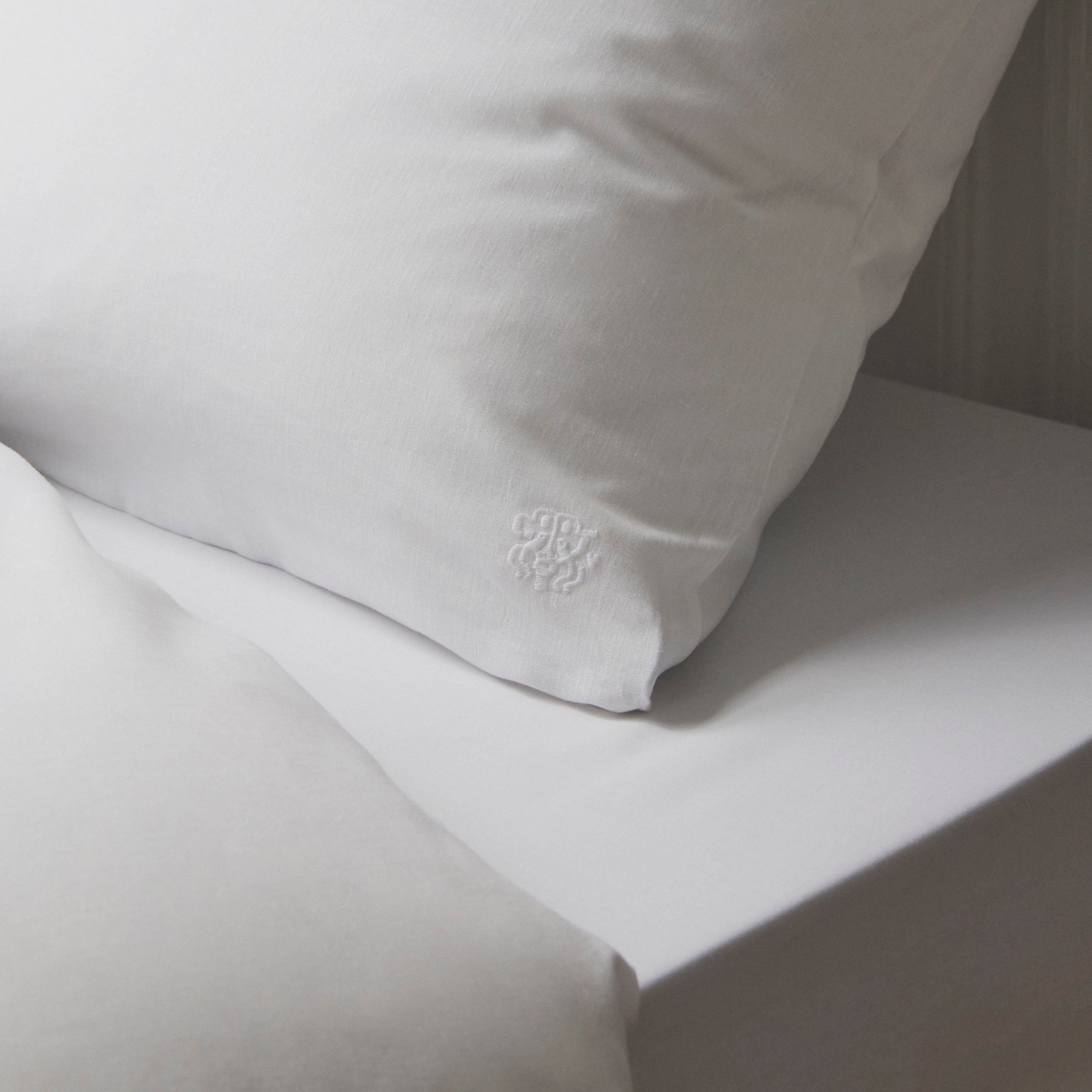 Even sängkläderna är vävda i linne och bomull för att förena de två materialens unika egenskaper. Linnets naturliga textur kombinerad med bomullens mjukhet och formstabilitet. Tillsammans ger det en vacker, matt och mjuk yta – samt andningsbara och slitstarka sängkläder.