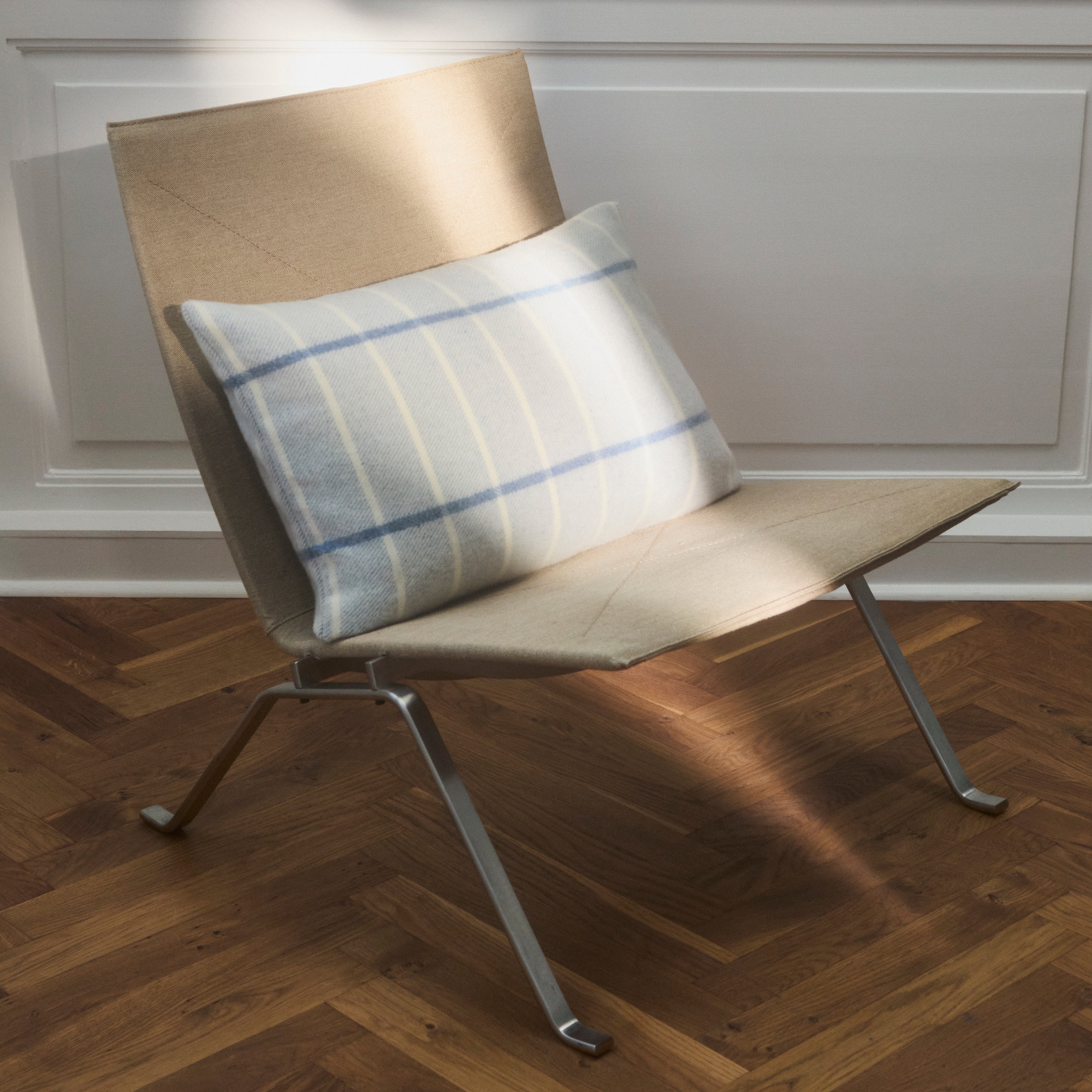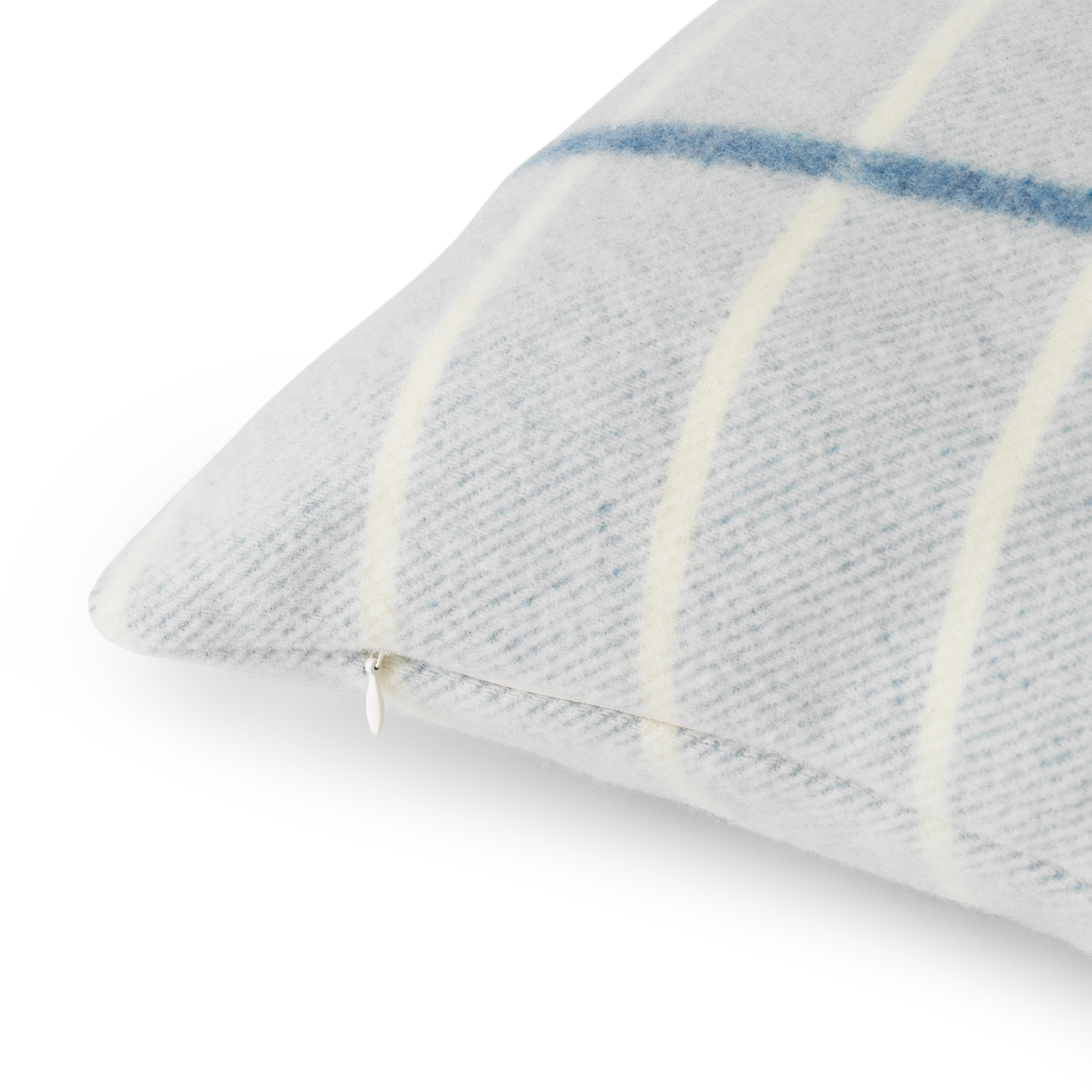 Tartan-kudden har ett elegant och klassiskt rutmönster. Kombinationen av 90 % merinoull och 10 % kashmir gör kudden extra mjuk, och ullens fina struktur tillför en särskild lätthet. Den är vävd i blå och vita nyanser.
