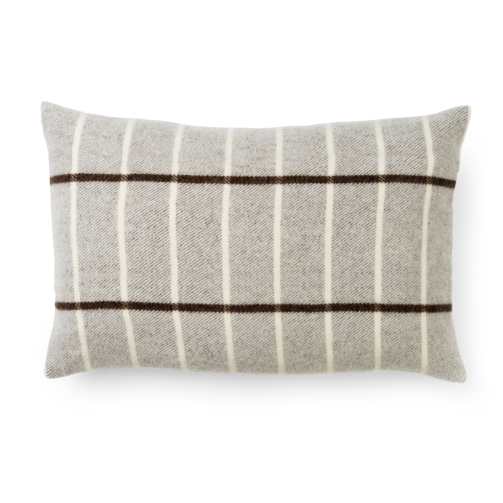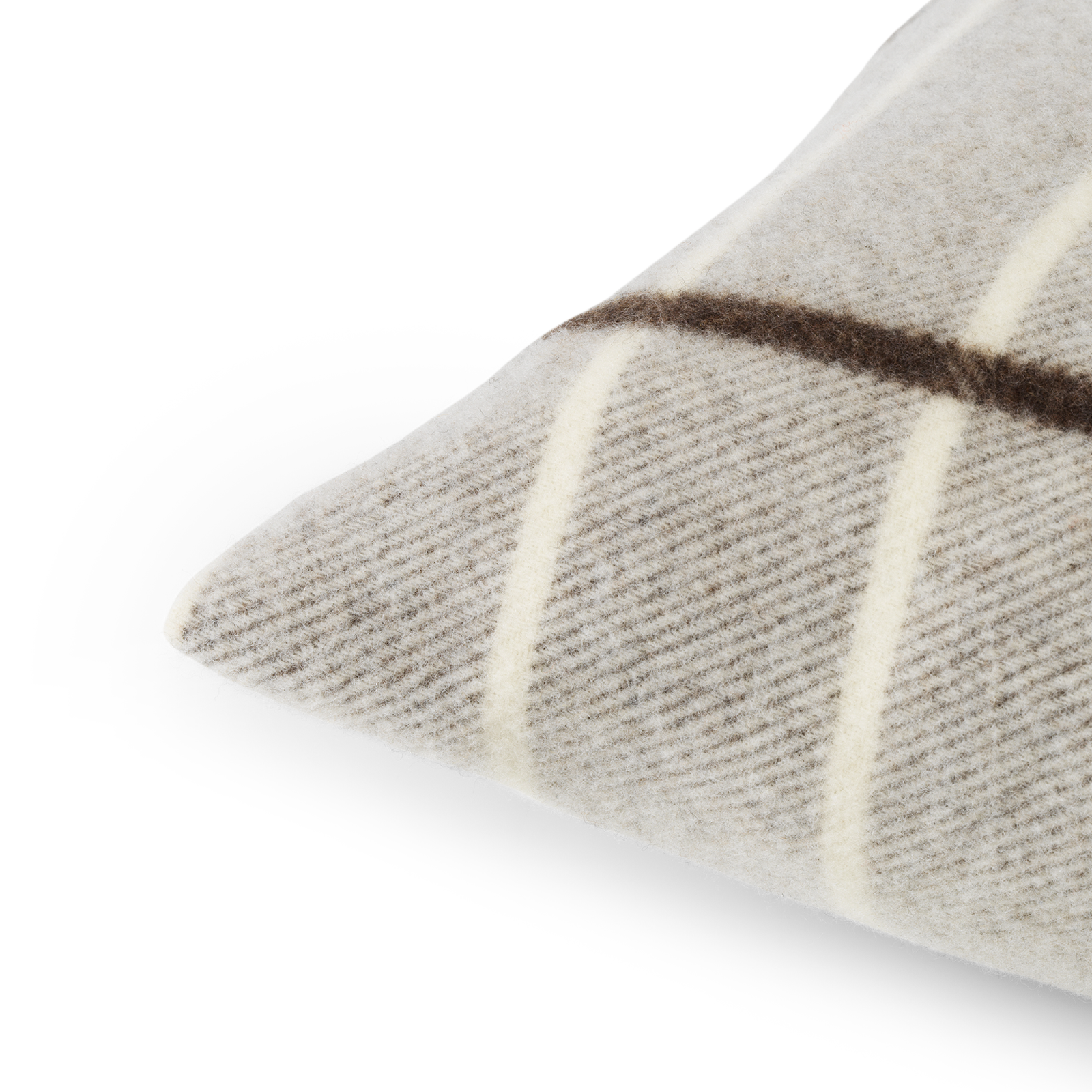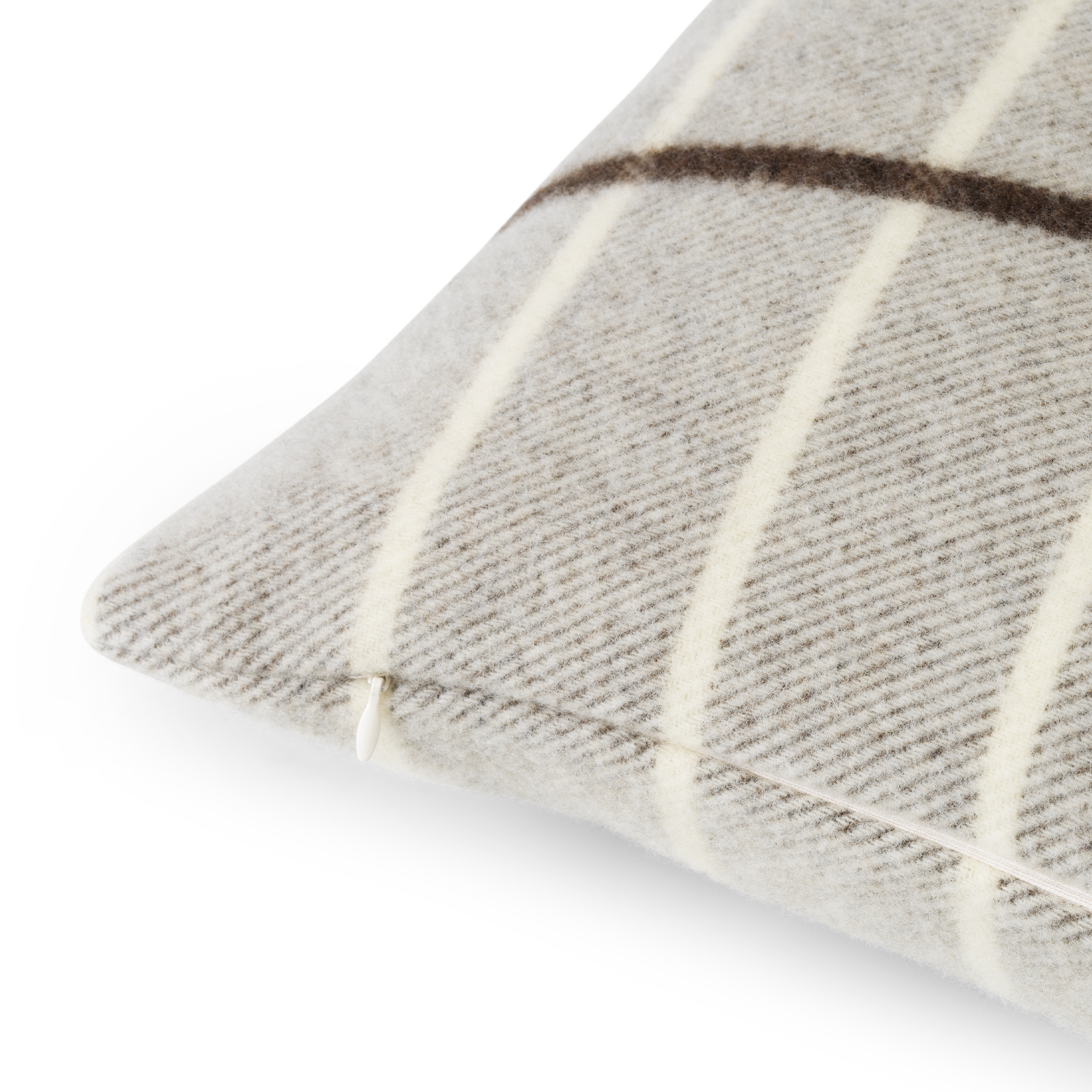 Tartan-kudden har ett elegant och klassiskt rutmönster. Kombinationen av 90 % merinoull och 10 % kashmir gör kudden extra mjuk, och ullens fina struktur tillför en särskild lätthet. Den är vävd i bruna och vita nyanser.