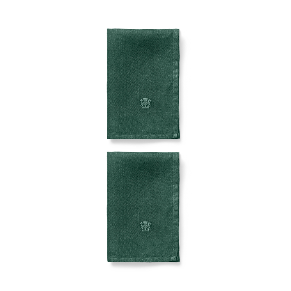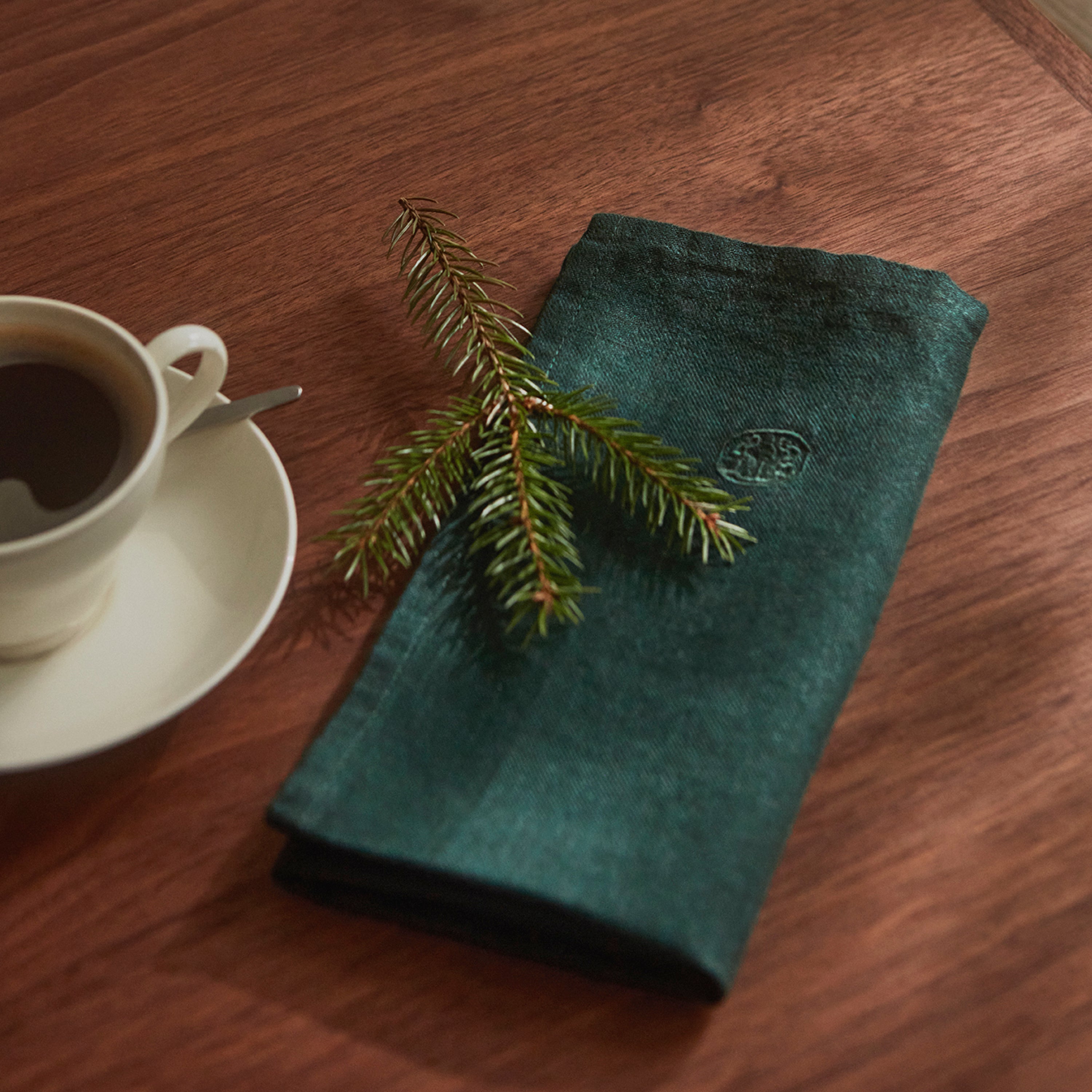 Med sin enkla design och djupt mörkgröna färg är linneservetten med broderad logo ett vackert inslag i dukningen. Den gröna färgen skapar en speciell gammaldags julstämning.