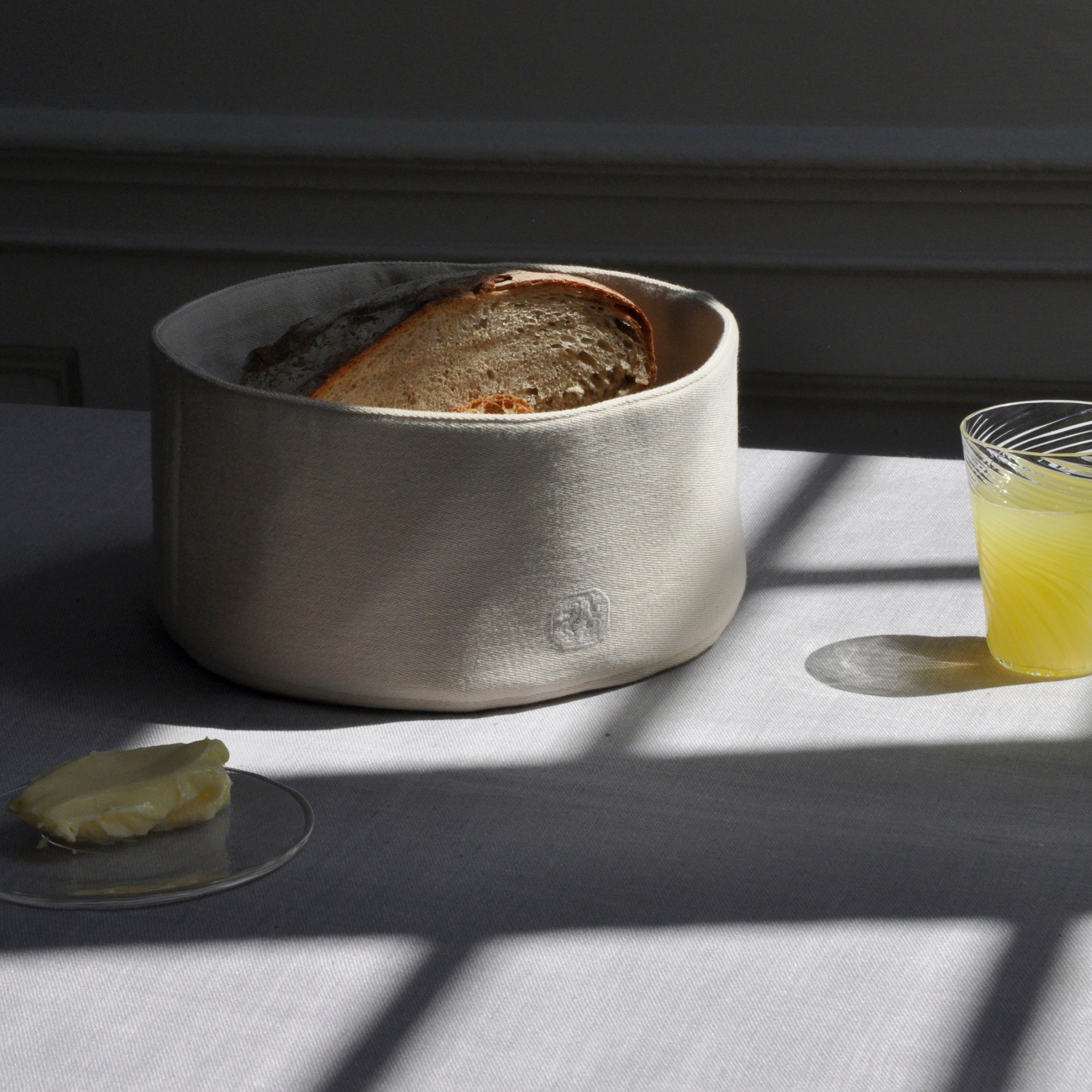 Plain-brödkorgen är sydd av satinvävd överskottstextilier från Georg Jensen Damasks produktion, vilket är väldigt meningsfullt i dagens värld. Tyget är i 100 % bomull och designen är gjord för att hålla i decennier. Brödkorgen ingår i en mindre kollektion av textila kökstillbehör som även omfattar kaffe- och tehuvor, grytlappar och förkläden.