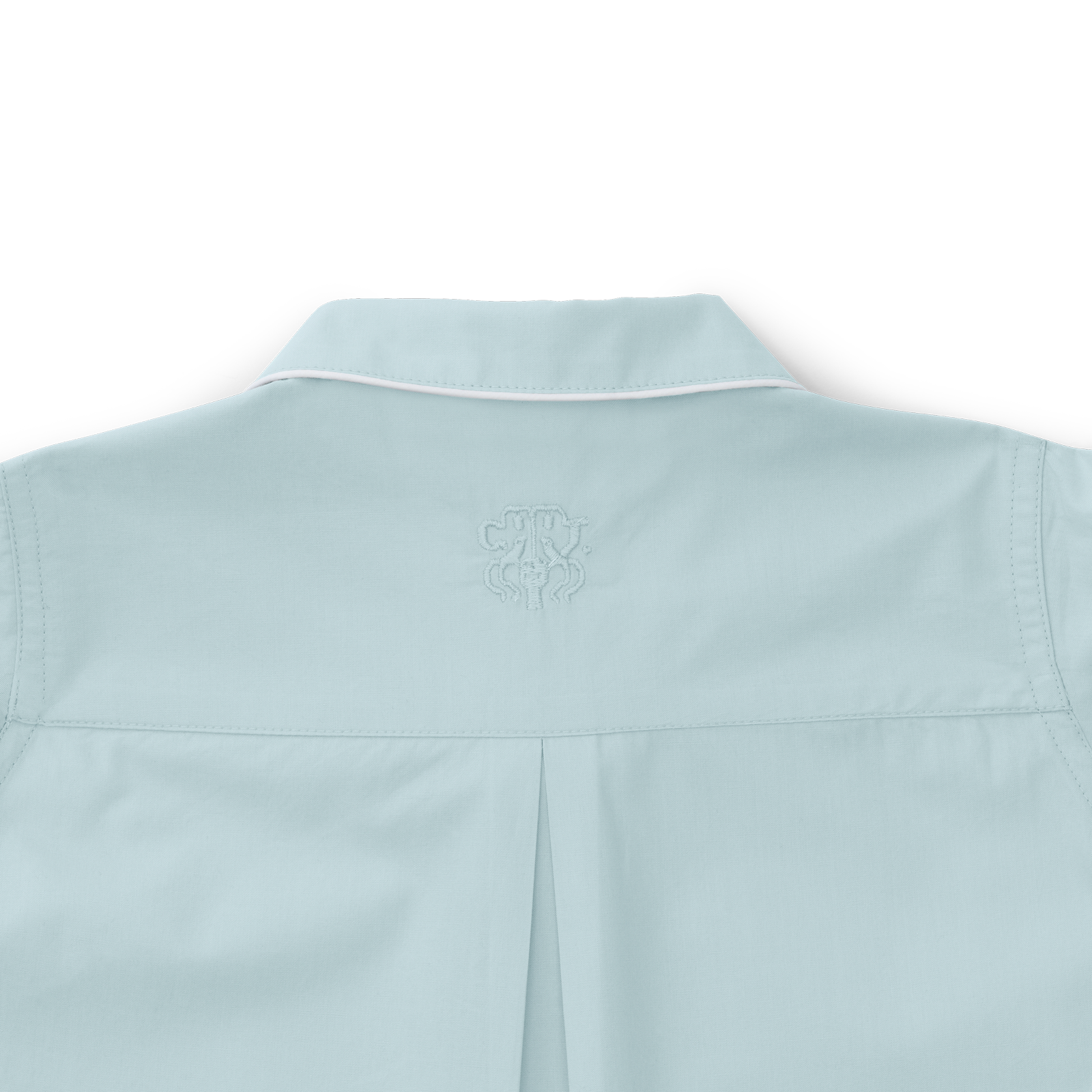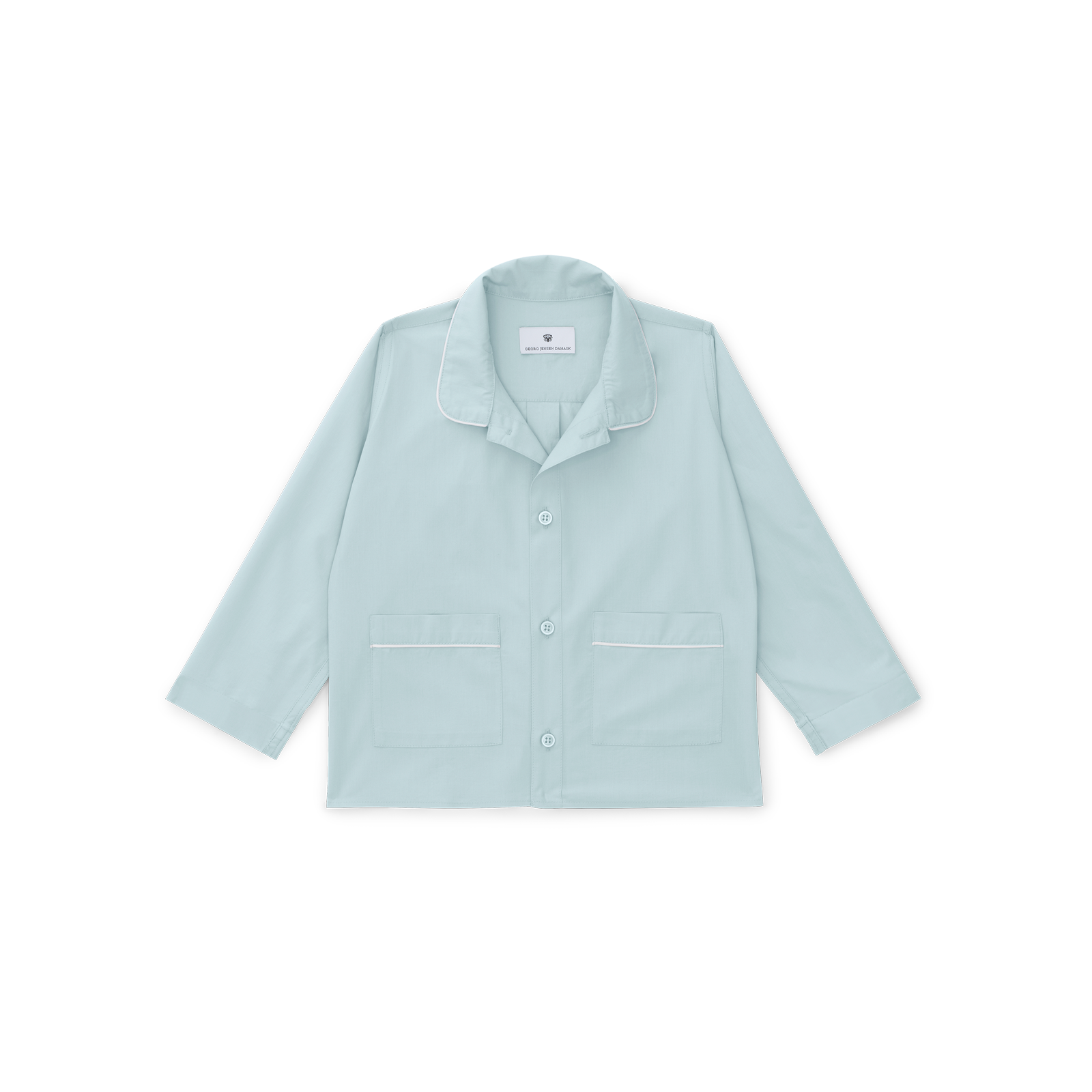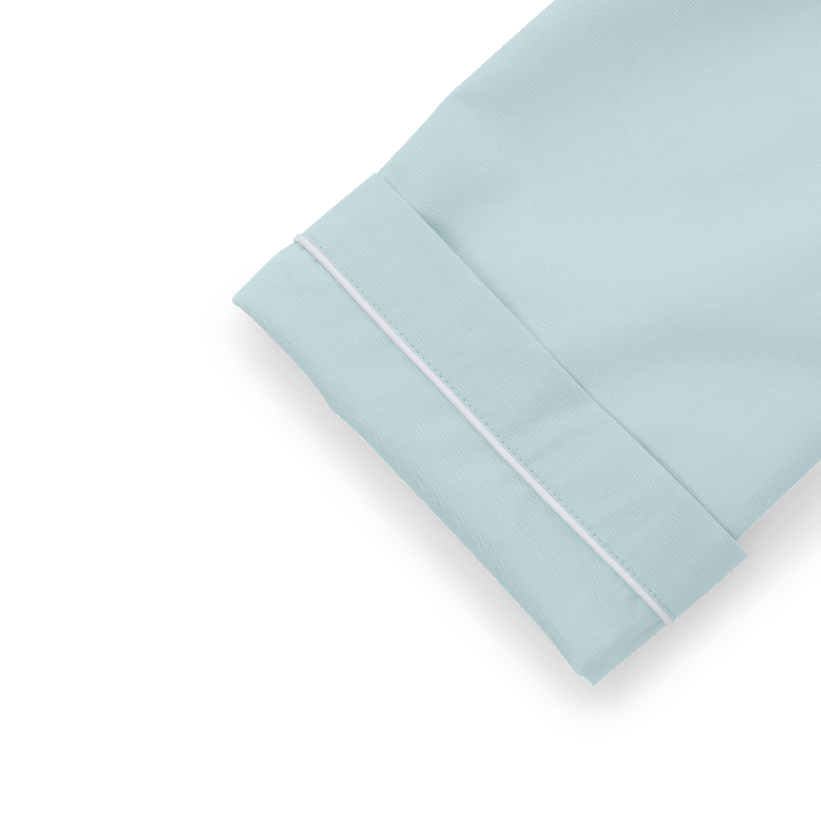 Unisexpyjamas för barn i percalevävd Supima-bomull. Minimal Blue är en mycket ljus nyans av blått med ett stänk av aquatoner.
