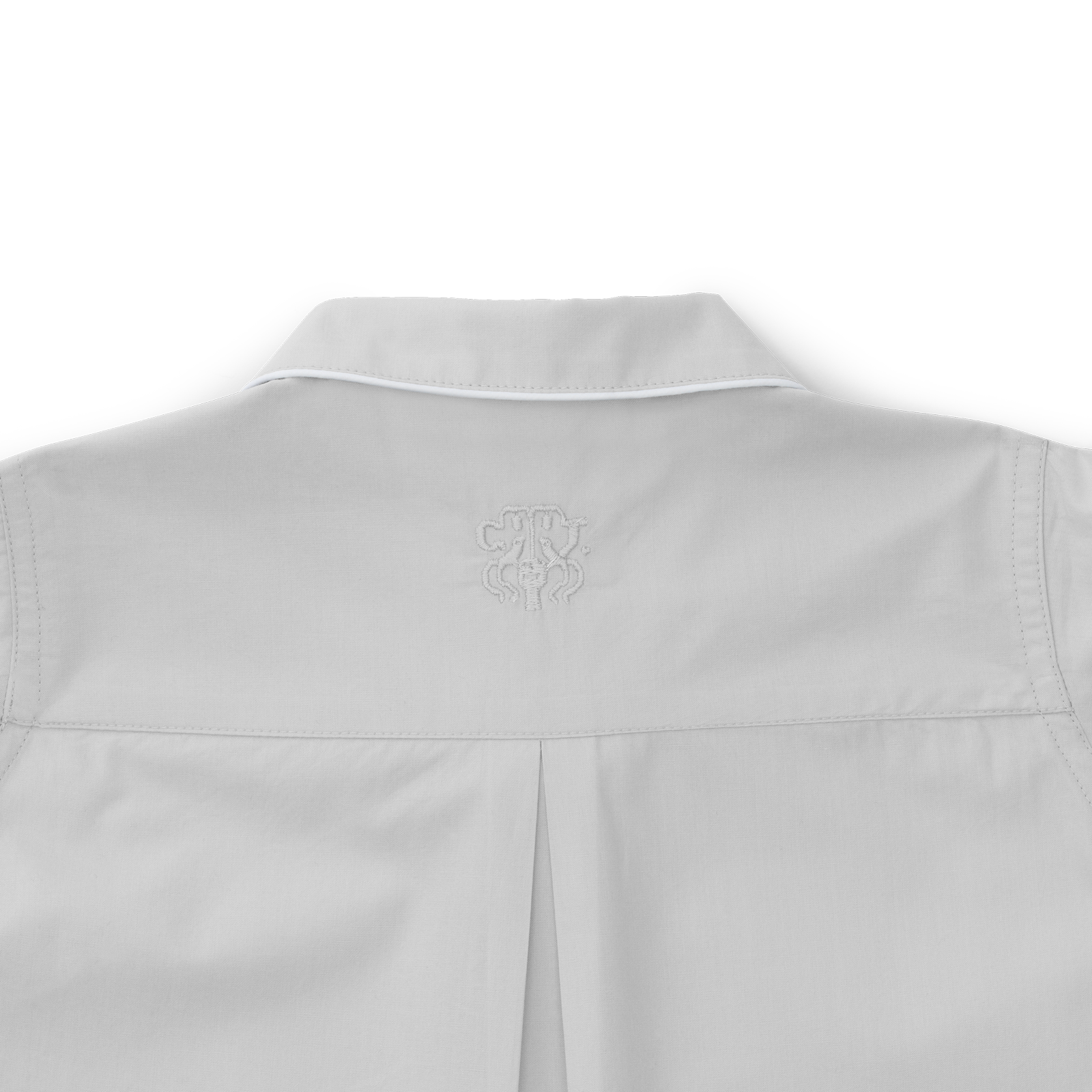 Skjortan har sidslitsar, bröstficka, rundad krage och Georg Jensen Damasks ikoniska logotyp broderad i oket i nacken. Byxorna har bred och bekväm resår i midjan samt fickor. Benslut och ärmar kan enkelt justeras med en uppvikning som avslöjar en elegant passpoal på insidan.