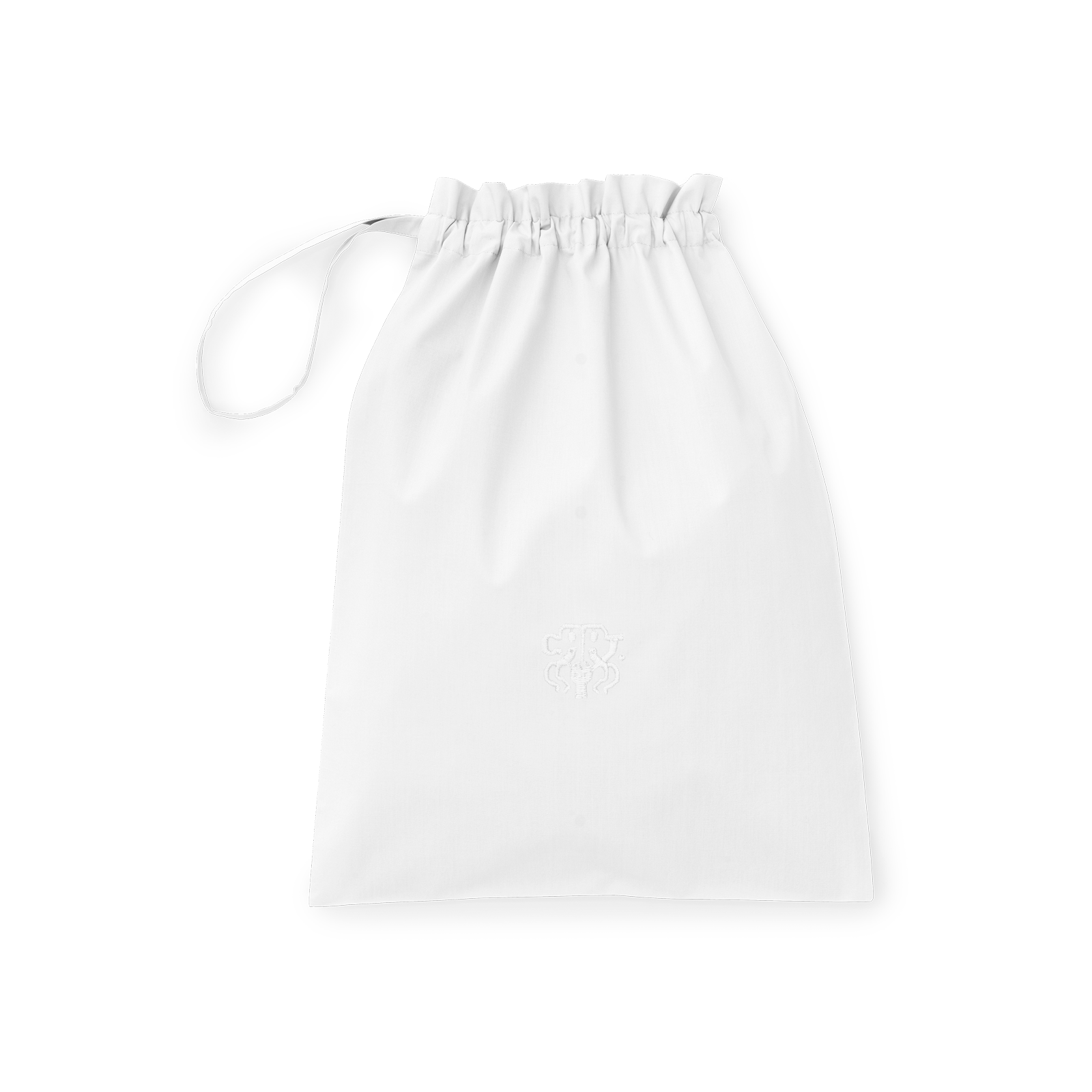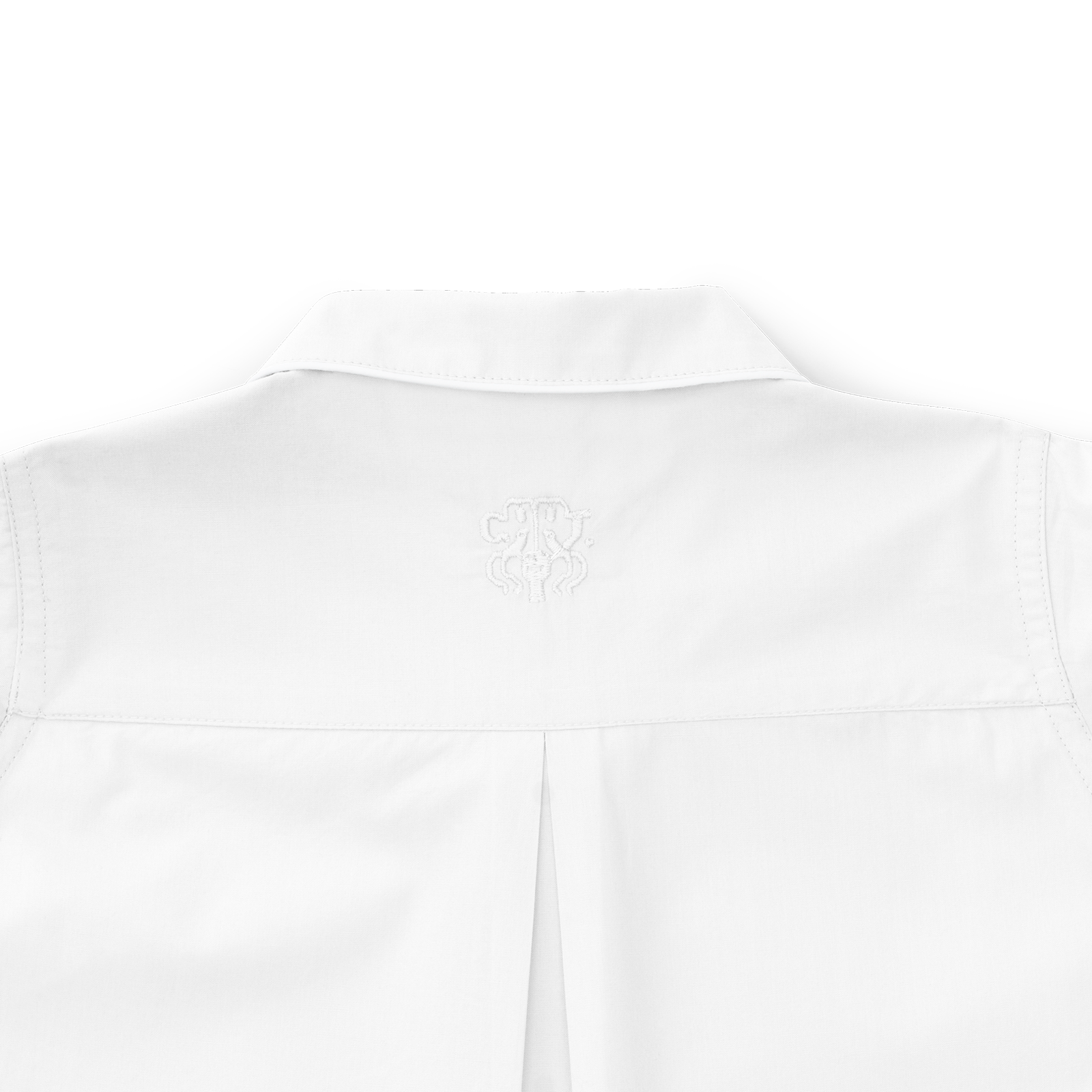 Skjortan har sidslitsar, bröstficka, rundad krage och Georg Jensen Damasks ikoniska logotyp broderad i oket i nacken. Byxorna har bred och bekväm resår i midjan samt fickor. Benslut och ärmar kan enkelt justeras med en uppvikning som avslöjar en elegant passpoal på insidan.