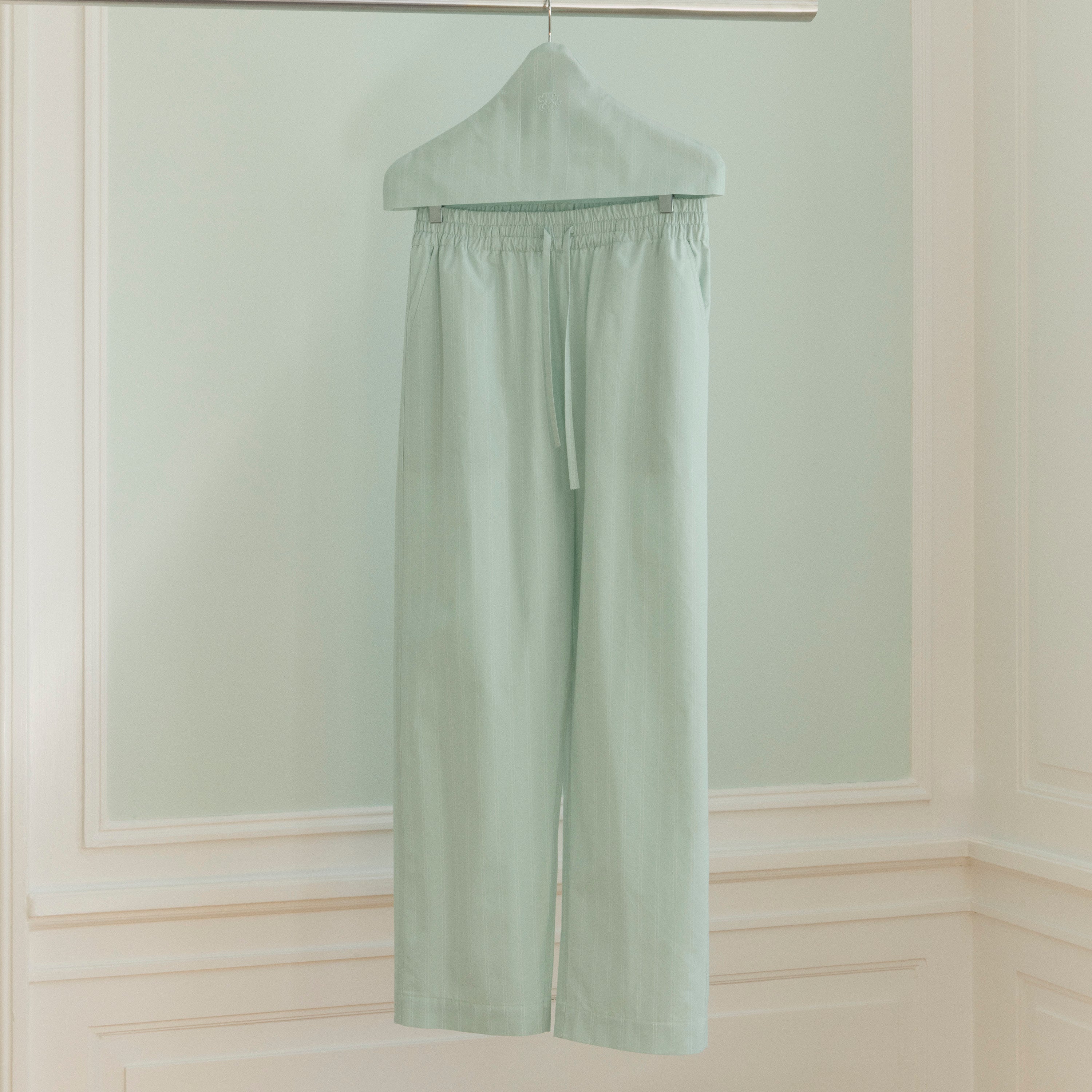 Unisex-pyjamas vävd i Supima bomull percale. Pyjamasen har en klassisk passform, eleganta vita kantband och smala nålrandiga ränder mot en bakgrund i färgen Glass Green – en klar, grönblå nyans inspirerad av färgen råglas.