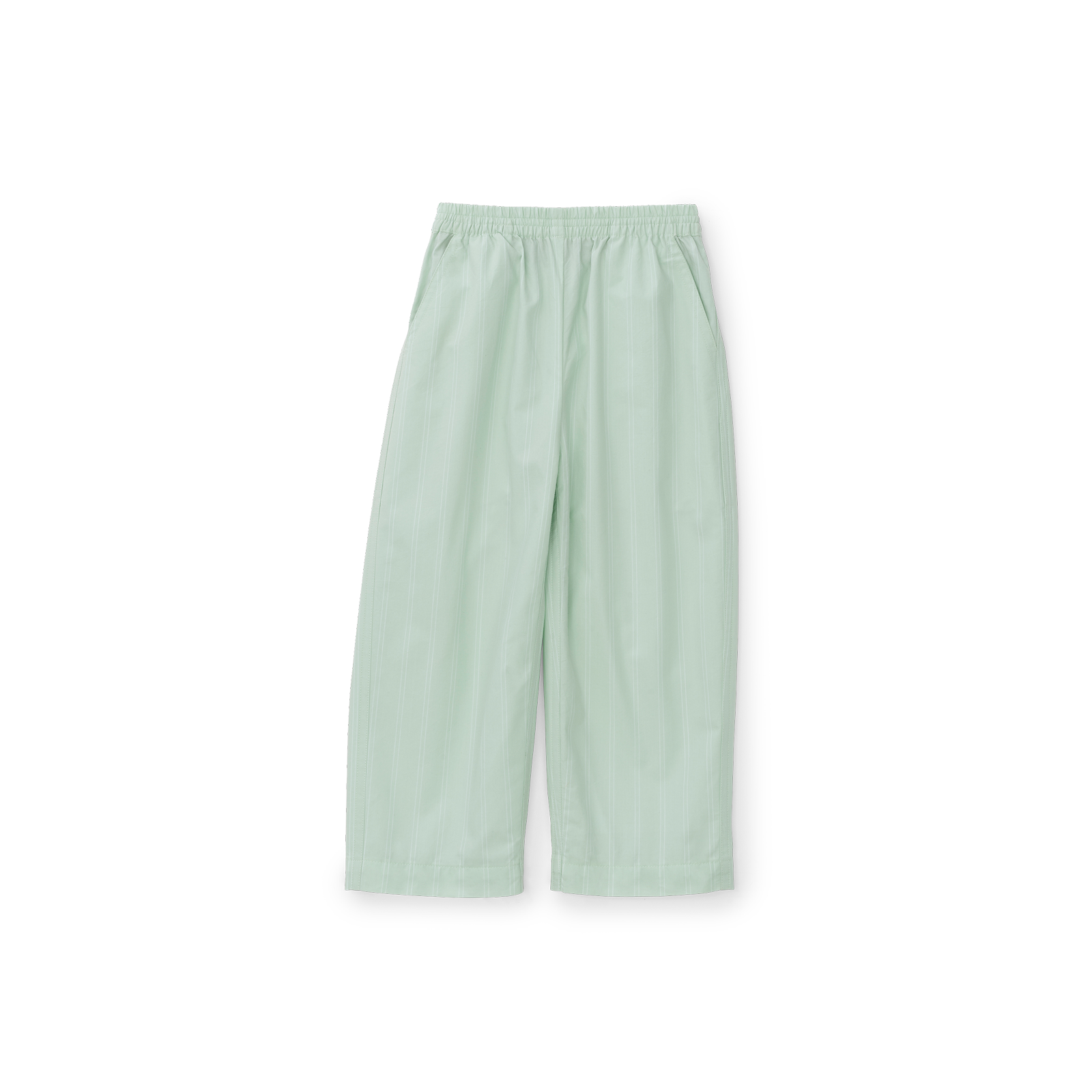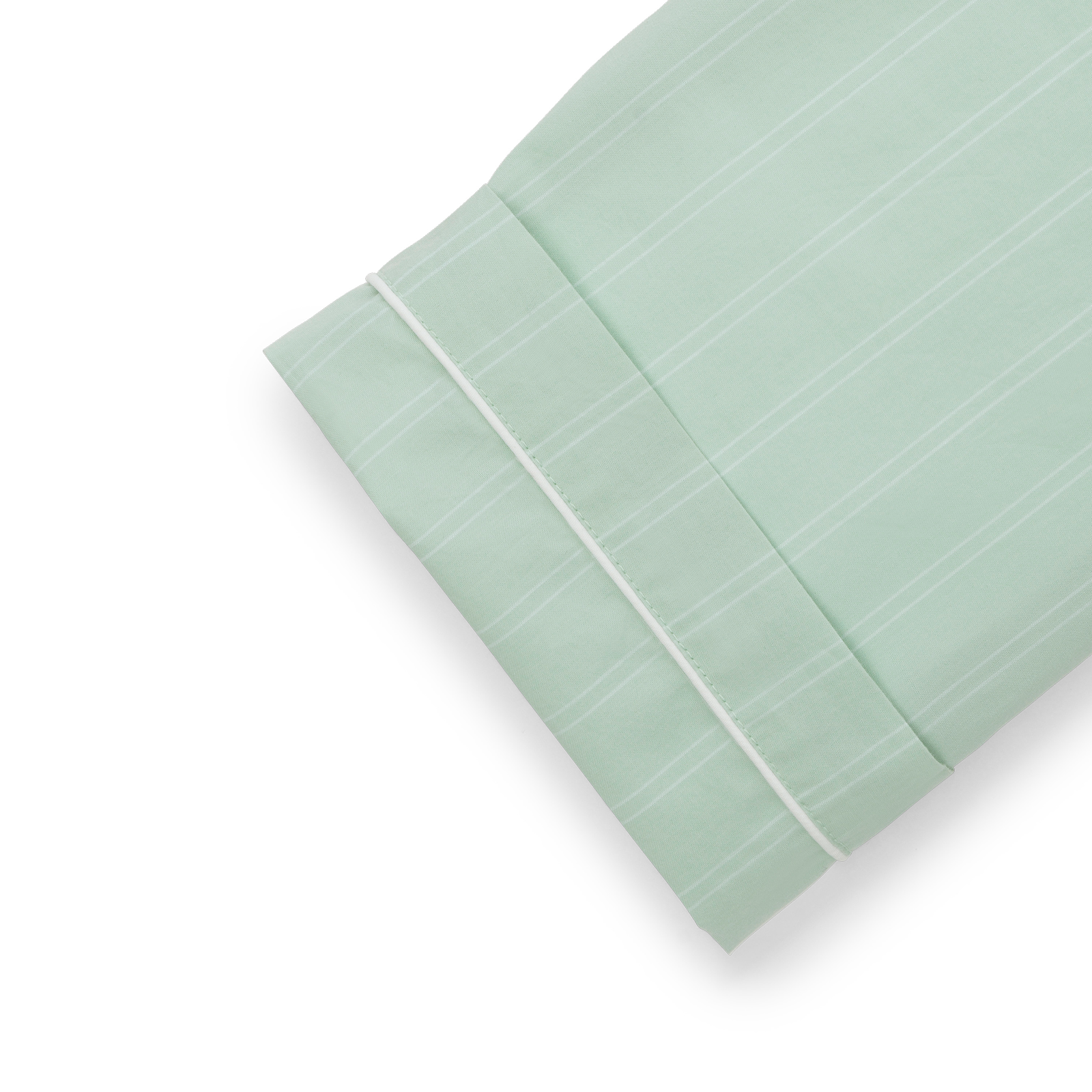 Unisex-pyjamas för barn vävd i Supima bomullsperkal. Pyjamasen har en klassisk passform, eleganta vita kantband och smala nålrandiga ränder mot en bakgrund i färgen Glass Green – en klar, grönblå nyans inspirerad av färgen på råglas.