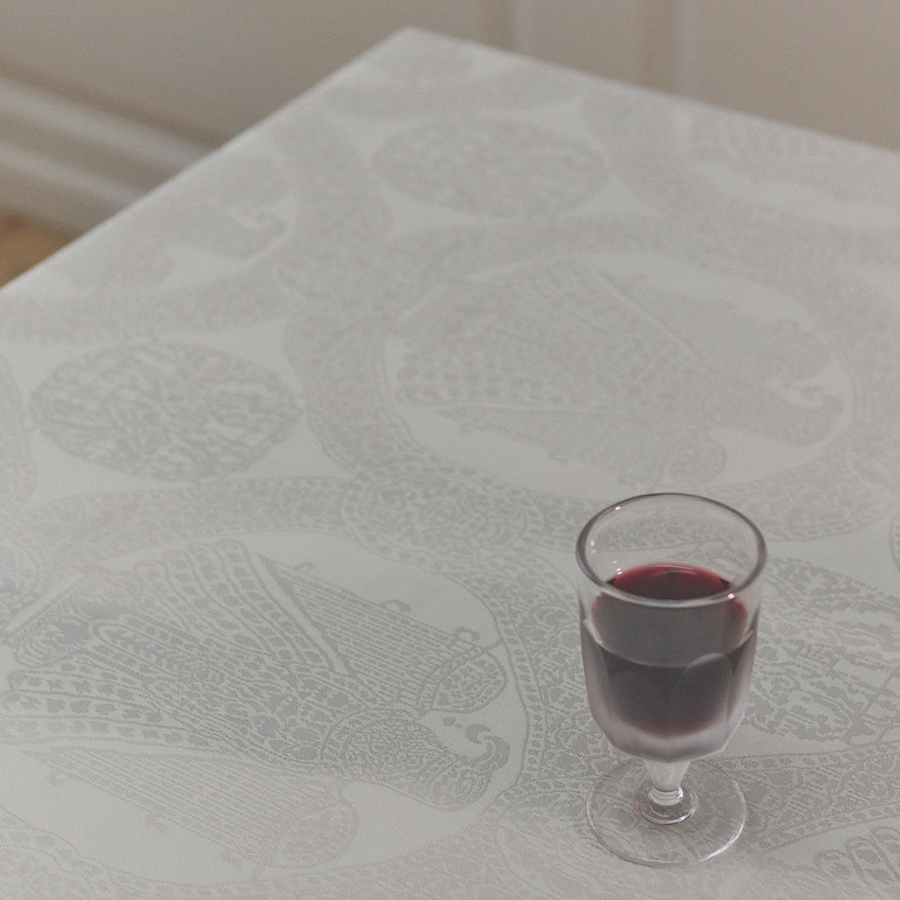 Duken är vävd i 100 % dubbeltvinnad kammad bomull och finns i en vacker ljusgrå färg, Light Grey. Den speciella damastvävningen ger Sct Knuds Ørne-duken ett vackert och skiftande uttryck.