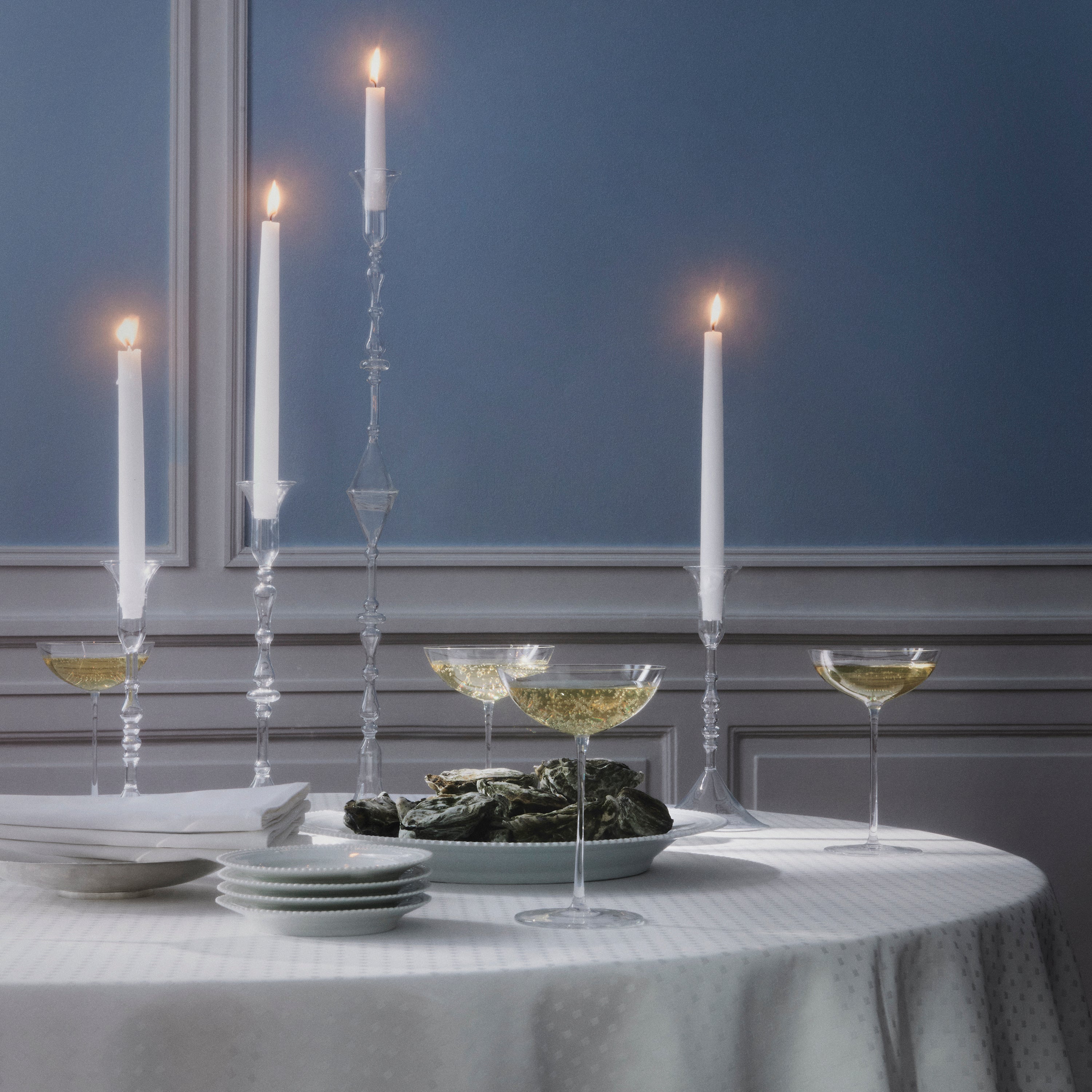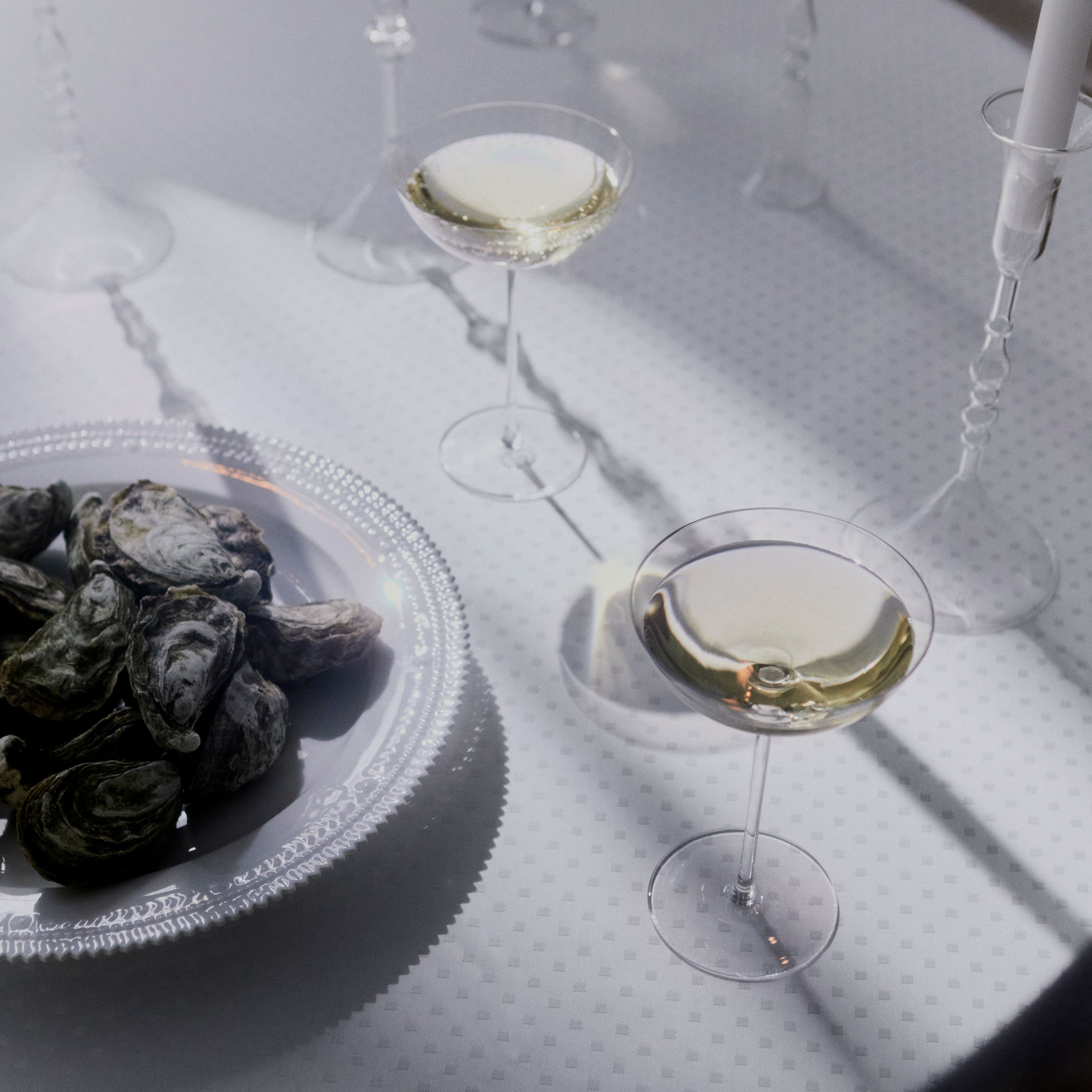 Snöflinga är designad av textilkonstnären Jette Nevers, som står bakom flera textilmönster för Georg Jensen Damask. Med inspiration från snöflingans renhet och stilla tillvaro i världen har hon skapat ett mönster vars enkelhet och strama uttryck ger bordet en rofylld känsla.