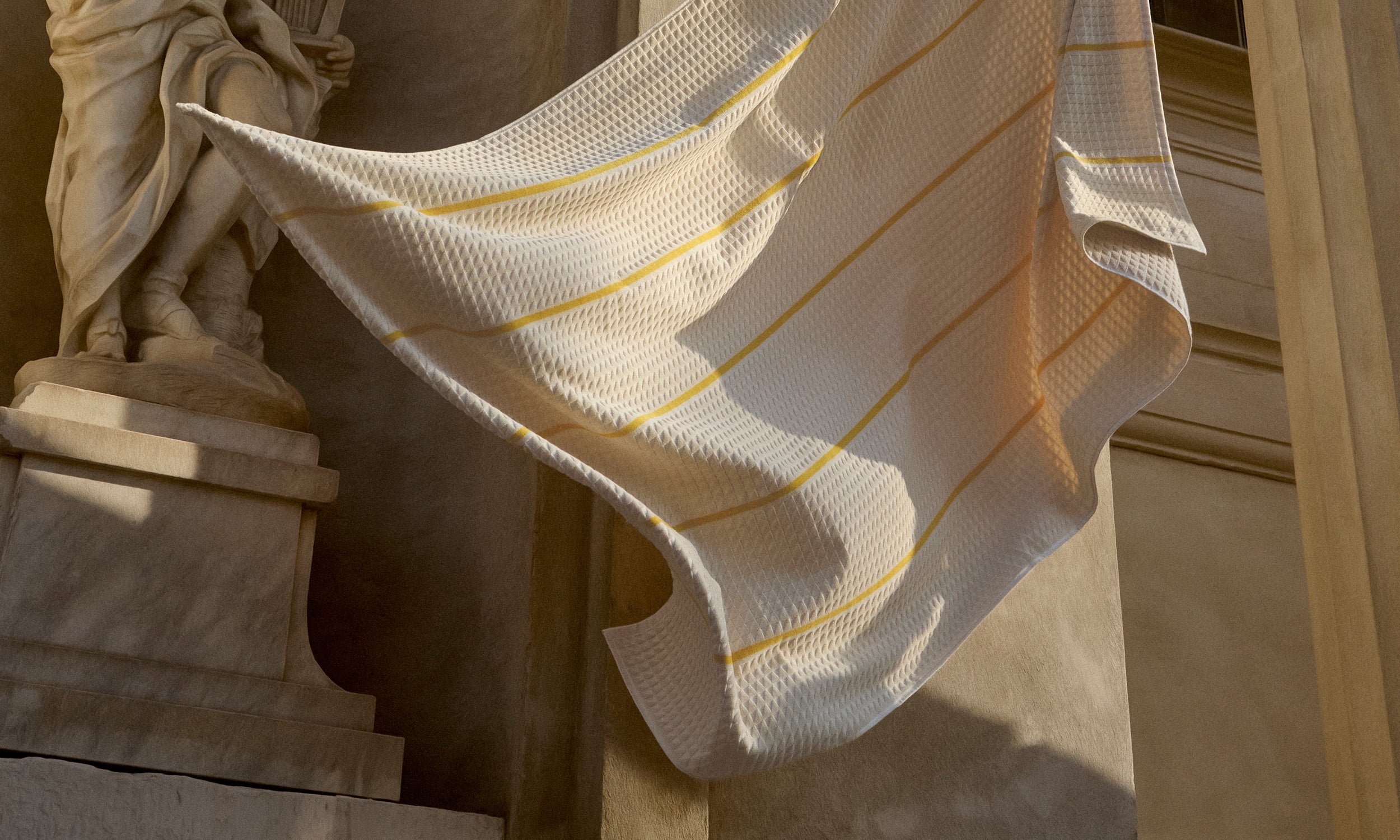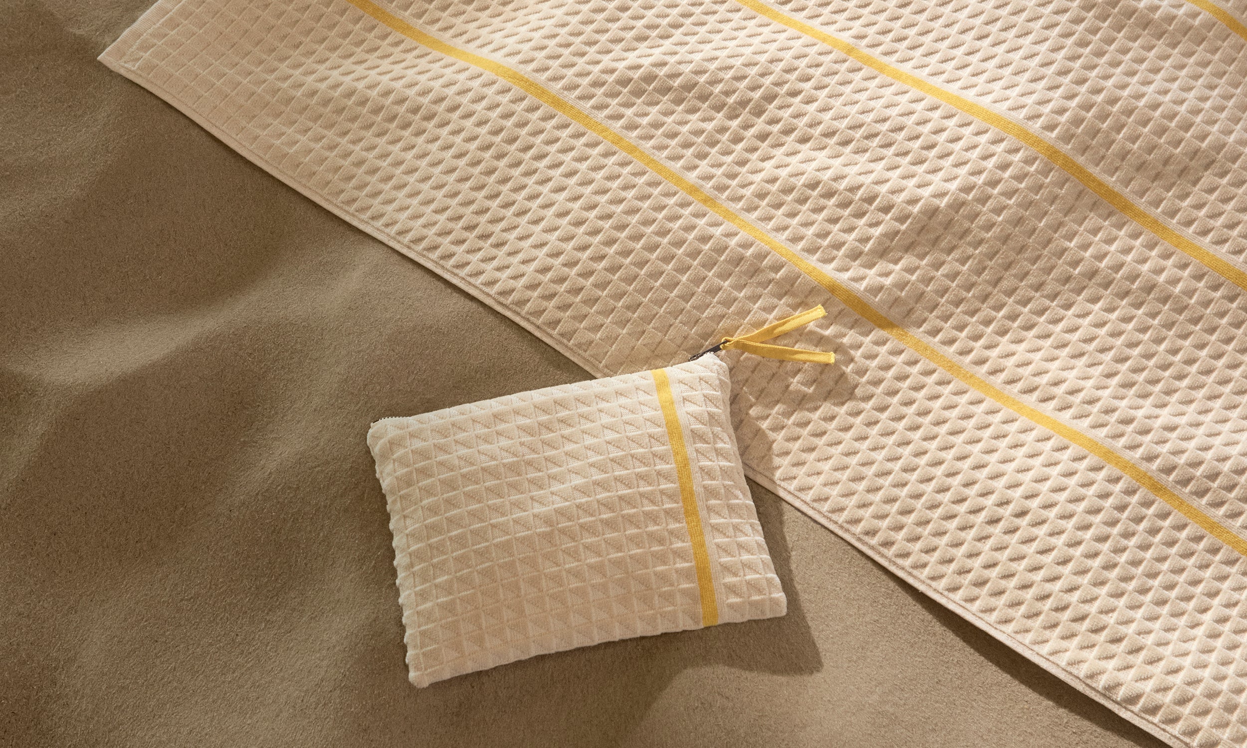 Med Facet udnyttede Jette Nevers jacqardvævningen til at skabe et elegant skyggespil i mønsterets sammenhængende trekanter. I Special Edition strandhåndklædet og clutchen fremhæves den smukke geometri i blød velourfrotté med lodrette delinger af solsikkegule striber.