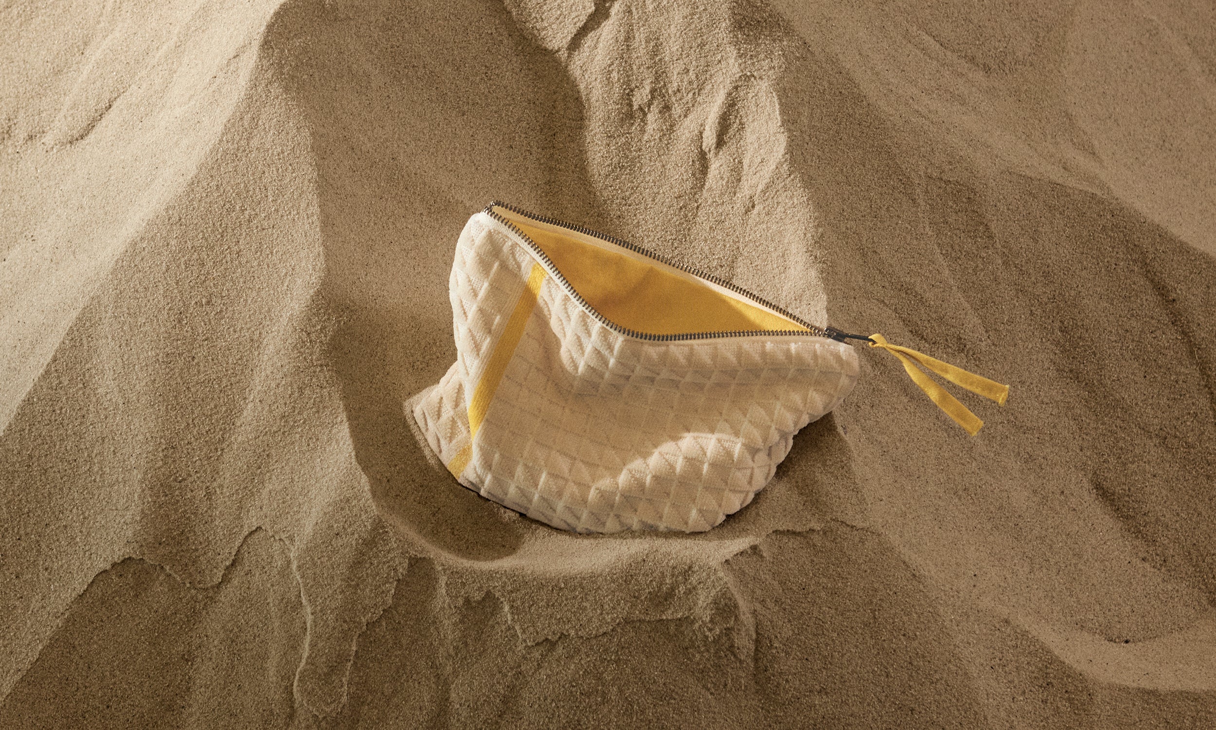 Clutchen är vävd i dubbeltvinnad kammad bomull som ger en särskilt mjuk och slät yta. Sandfärgen är inspirerad av klassiska sandstensfasader och varma stränder och ger ett exklusivt uttryck. Clutchen är perfekt för solcreme, nycklar och telefon.