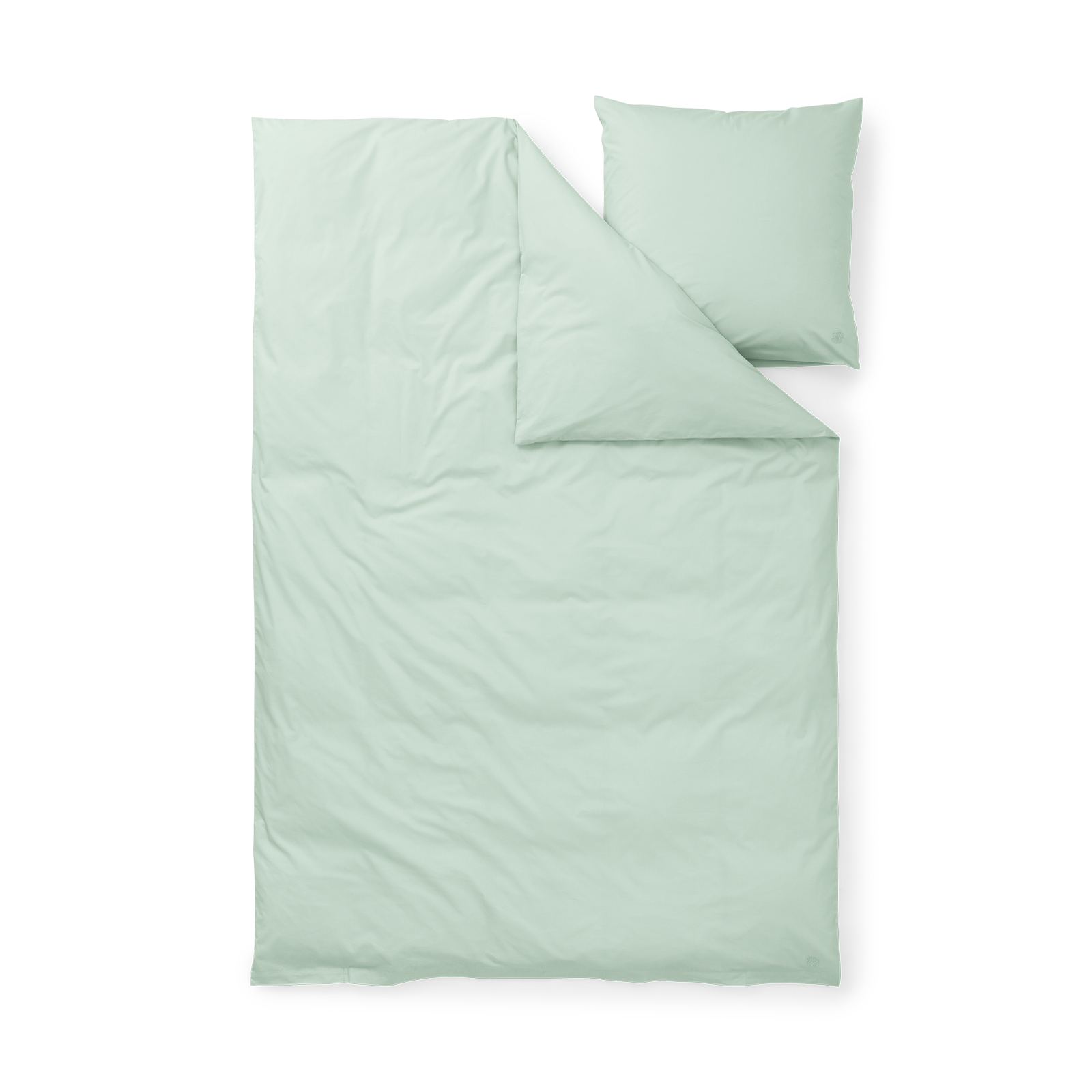 Påslakanet har knytband och örngottet kuvertstängning. Bäddsetet har Georg Jensen Damasks ikoniska logotyp som ett diskret broderi. Den klara grönblå färgen Glass Green är inspirerad av färgen på råglas.