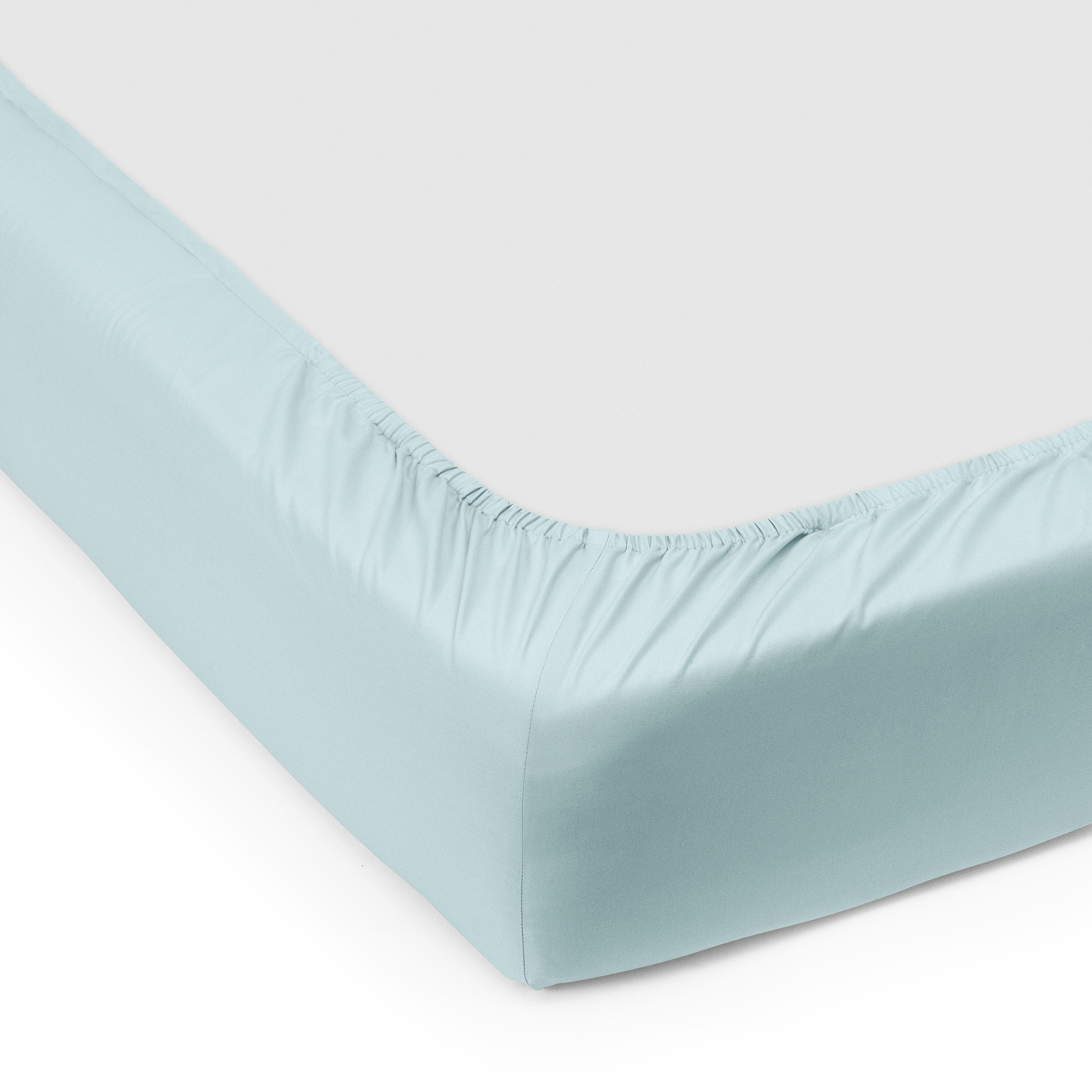 Boxlakanet är formsytt och har gummiband i hörnen. På lakanet finns Georg Jensen Damasks ikoniska logotyp som ett diskret broderi. Minimal Blue är en mycket ljus variant av ljusblå med en lätt ton av aqua.