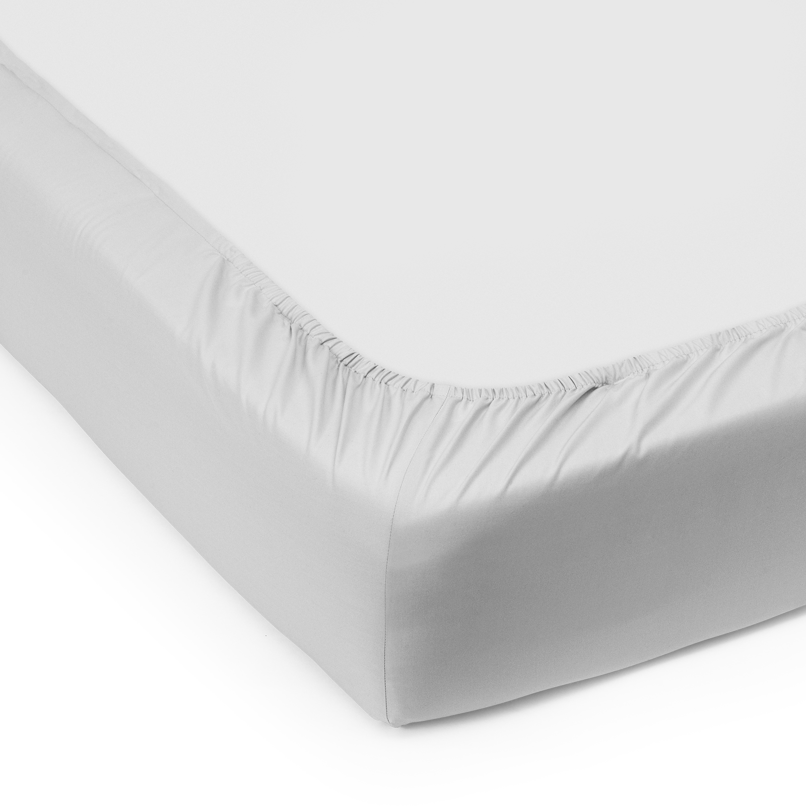 Boxlakanet är formsytt och har gummiband i hörnen. På lakanet finns Georg Jensen Damasks ikoniska logotyp som ett diskret broderi. Platinium Grey är en ljus och lugn nyans av grått.