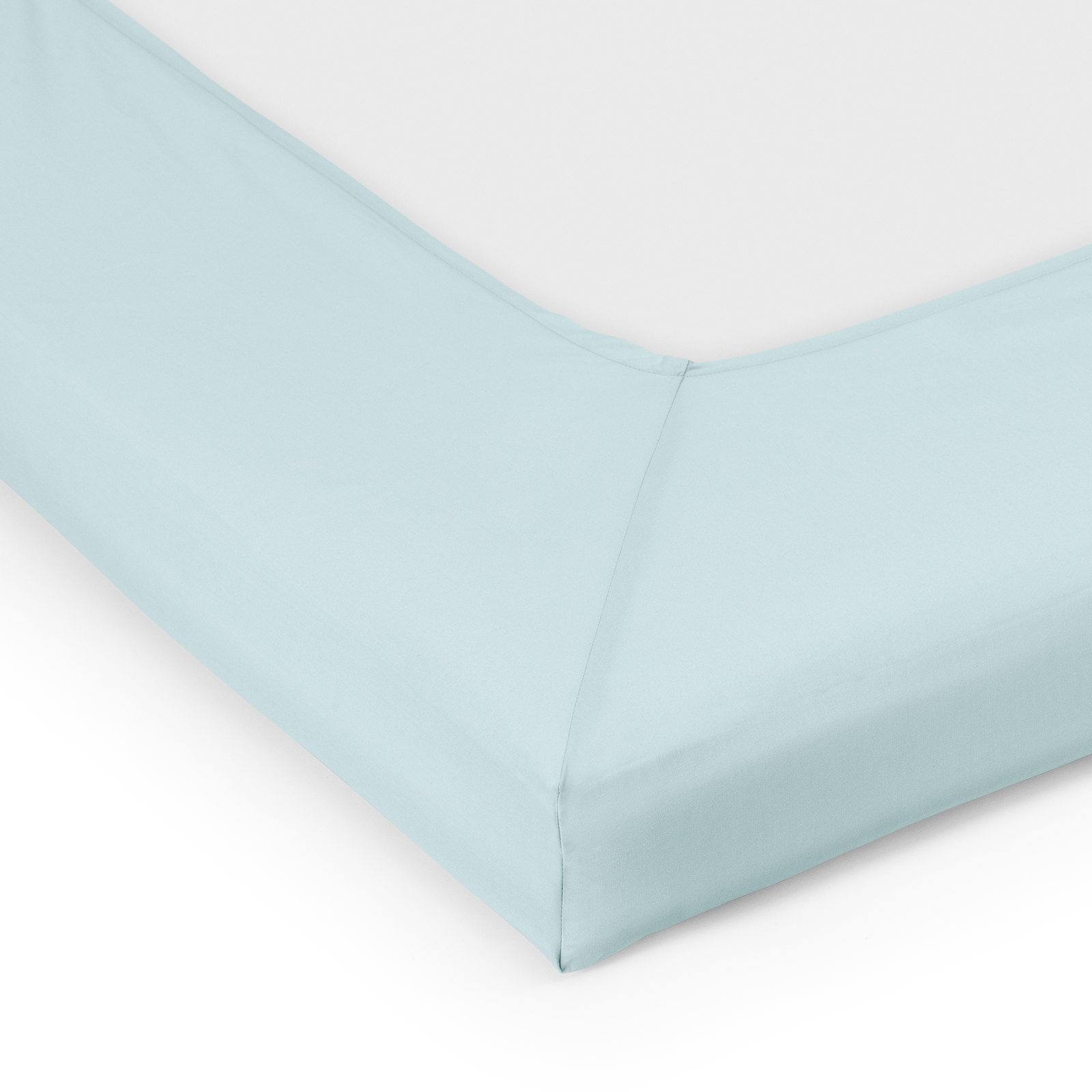 Kuvertlakanet är formsytt och passar en 8 cm tjock toppmadrass. På lakanet finns Georg Jensen Damasks ikoniska logotyp som ett diskret broderi. Minimal Blue är en mycket ljus variant av ljusblå med en lätt ton av aqua.