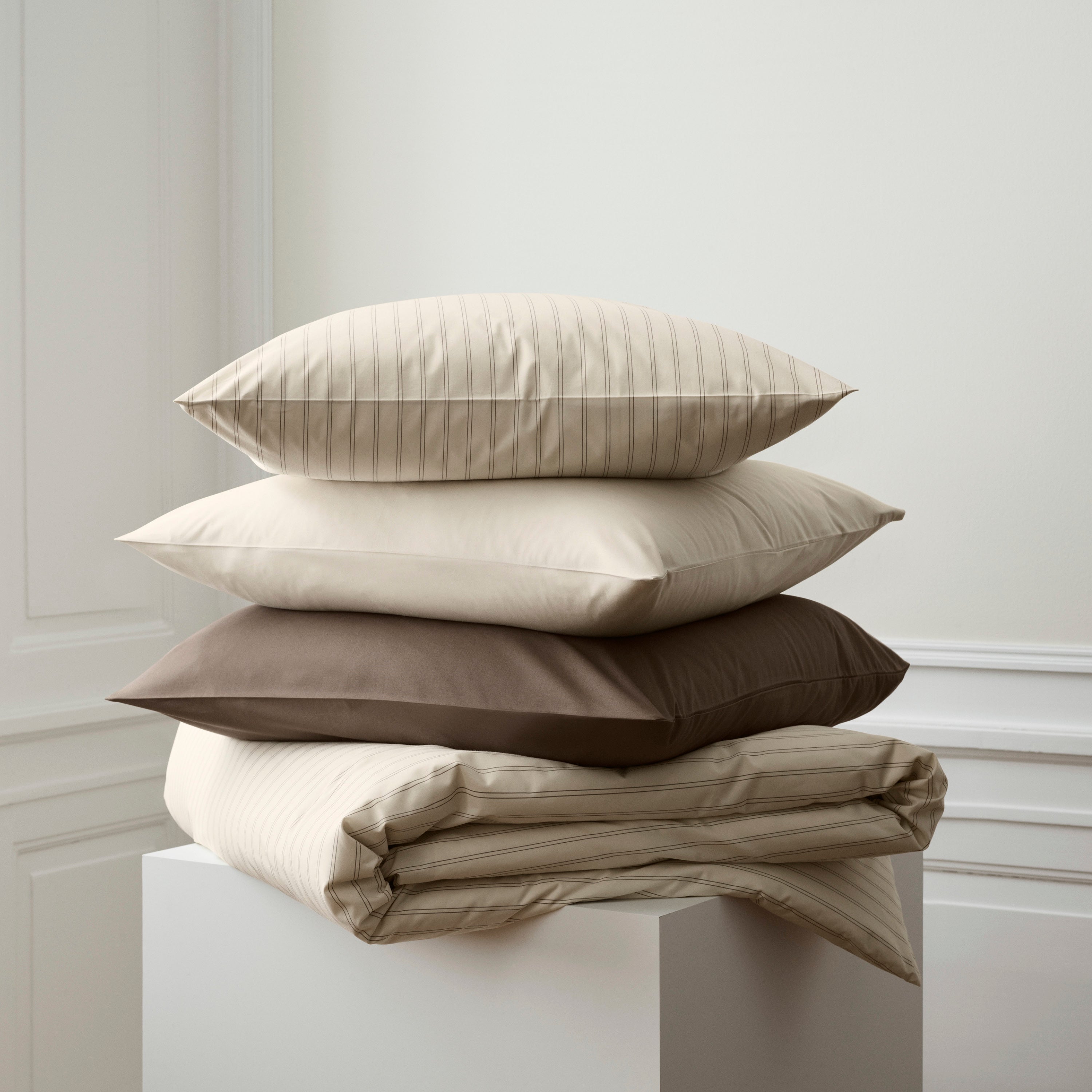 Supima Percale-sortimentet omfattar allt från sänggavlar och kuddar till Duntäcke och lakan i färger som ljusgrått, ljusgrönt, svalt blått och varma jordtoner. De långa bomullsfibrerna ger sängkläderna en särskilt vacker och mycket enhetlig färgton.