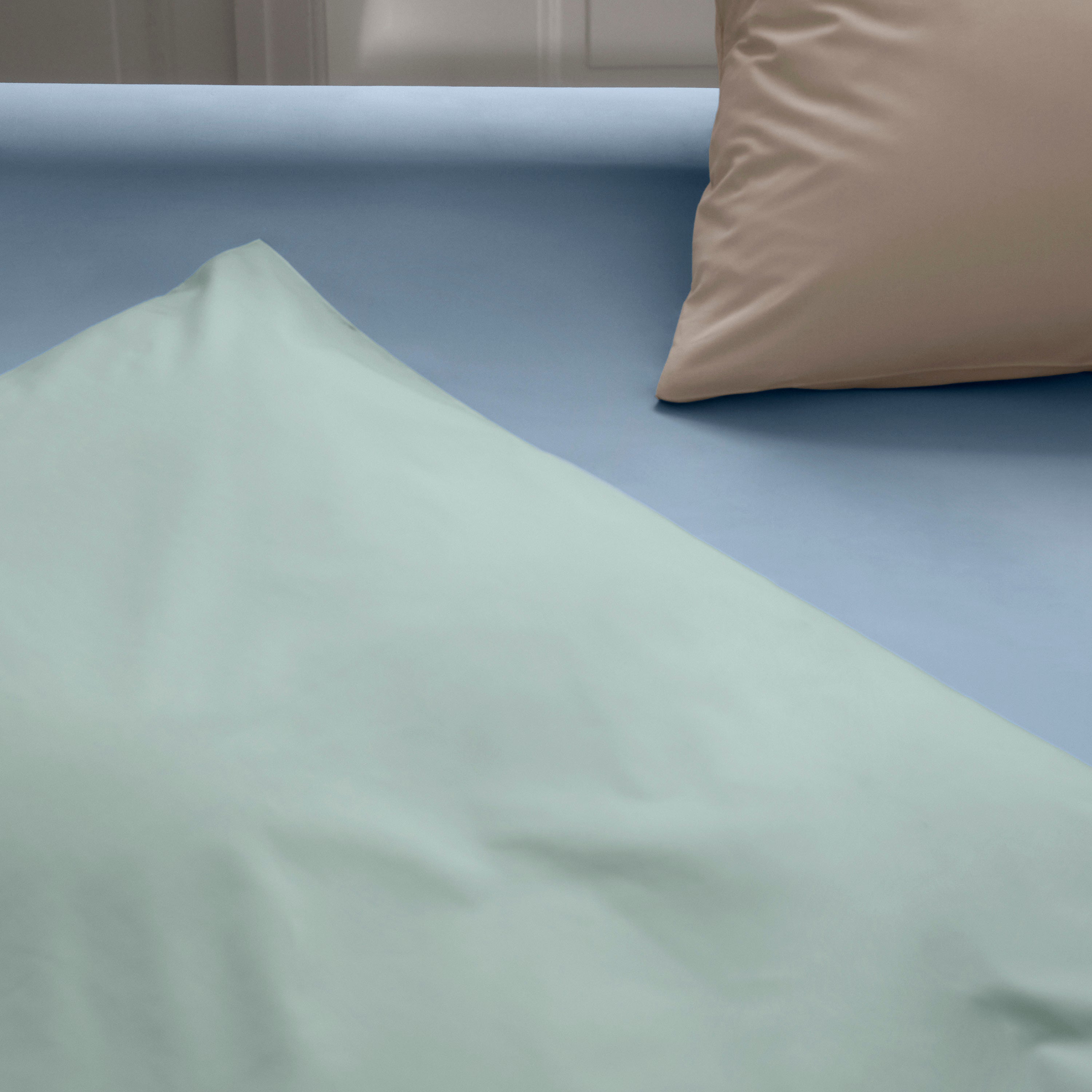 Supima Percale-sortimentet omfattar allt från sänggavlar och kuddar till Duntäcke och lakan i färger som ljusgrått, ljusgrönt, svalt blått och varma jordtoner. De långa bomullsfibrerna ger sängkläderna en särskilt vacker och mycket enhetlig färgton.