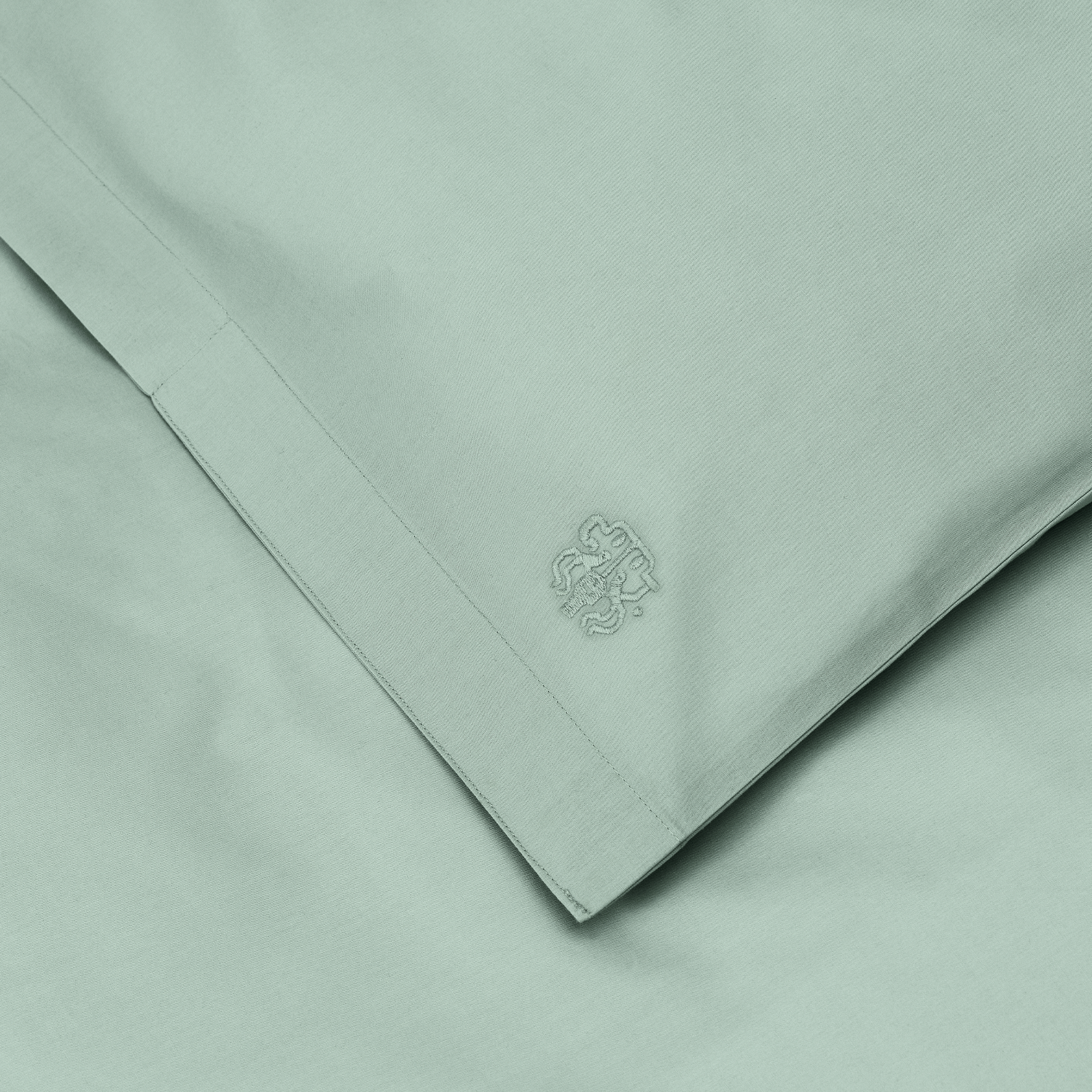 Påslakanet har knytband och örngotten kuvertstängning. Bäddsetet har Georg Jensen Damasks ikoniska logotyp som ett diskret broderi. Sage Green är en grön nyans med diskreta blågrå undertoner.