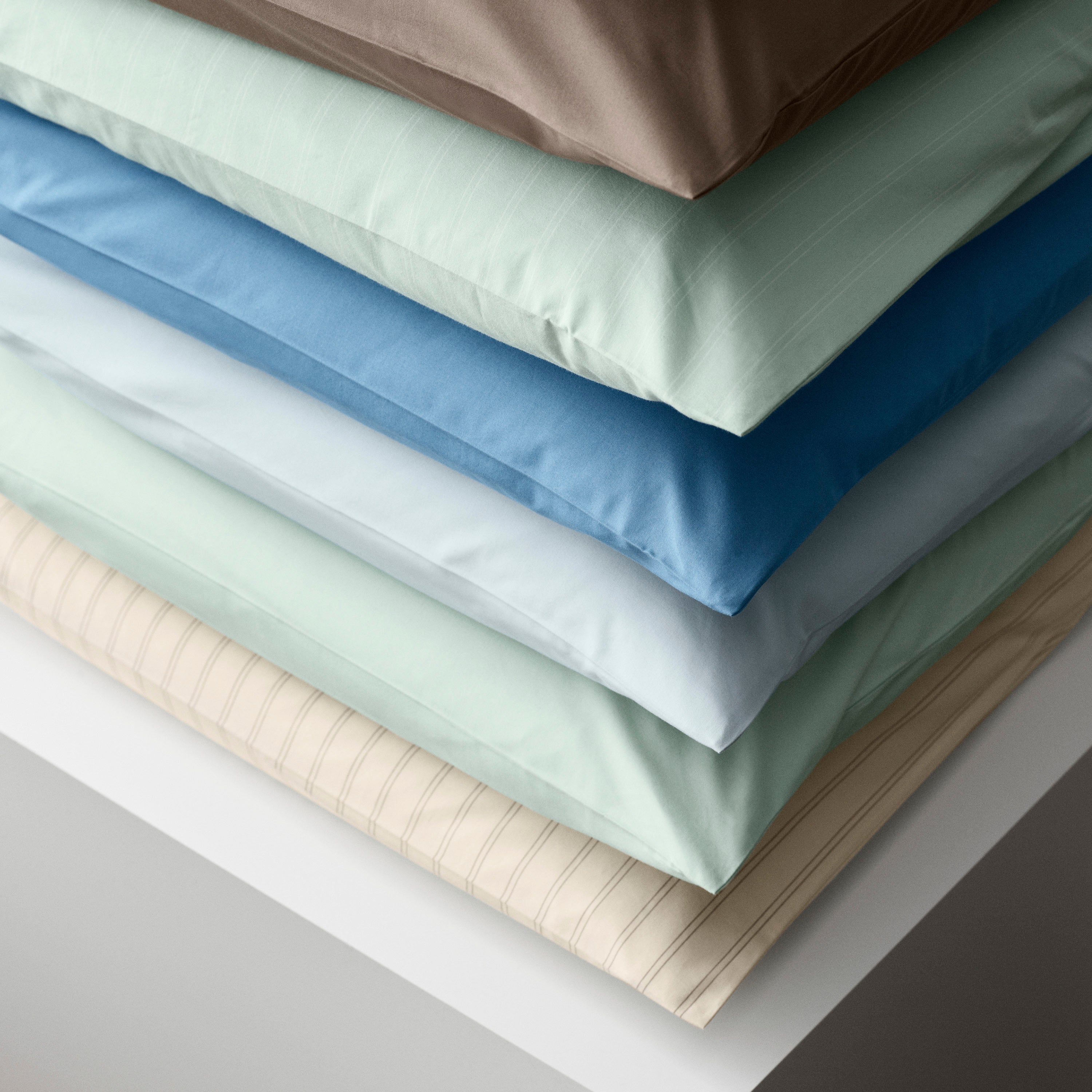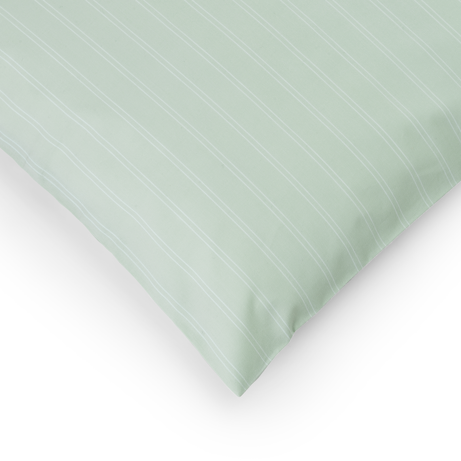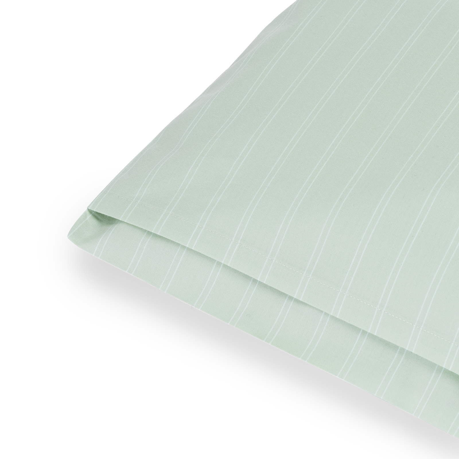 Supima Pinstripe örngott har smala, vita nålrandiga ränder med en bakgrund i färgen Glass Green – en klar grönblå nyans inspirerad av färgen på råglas.
