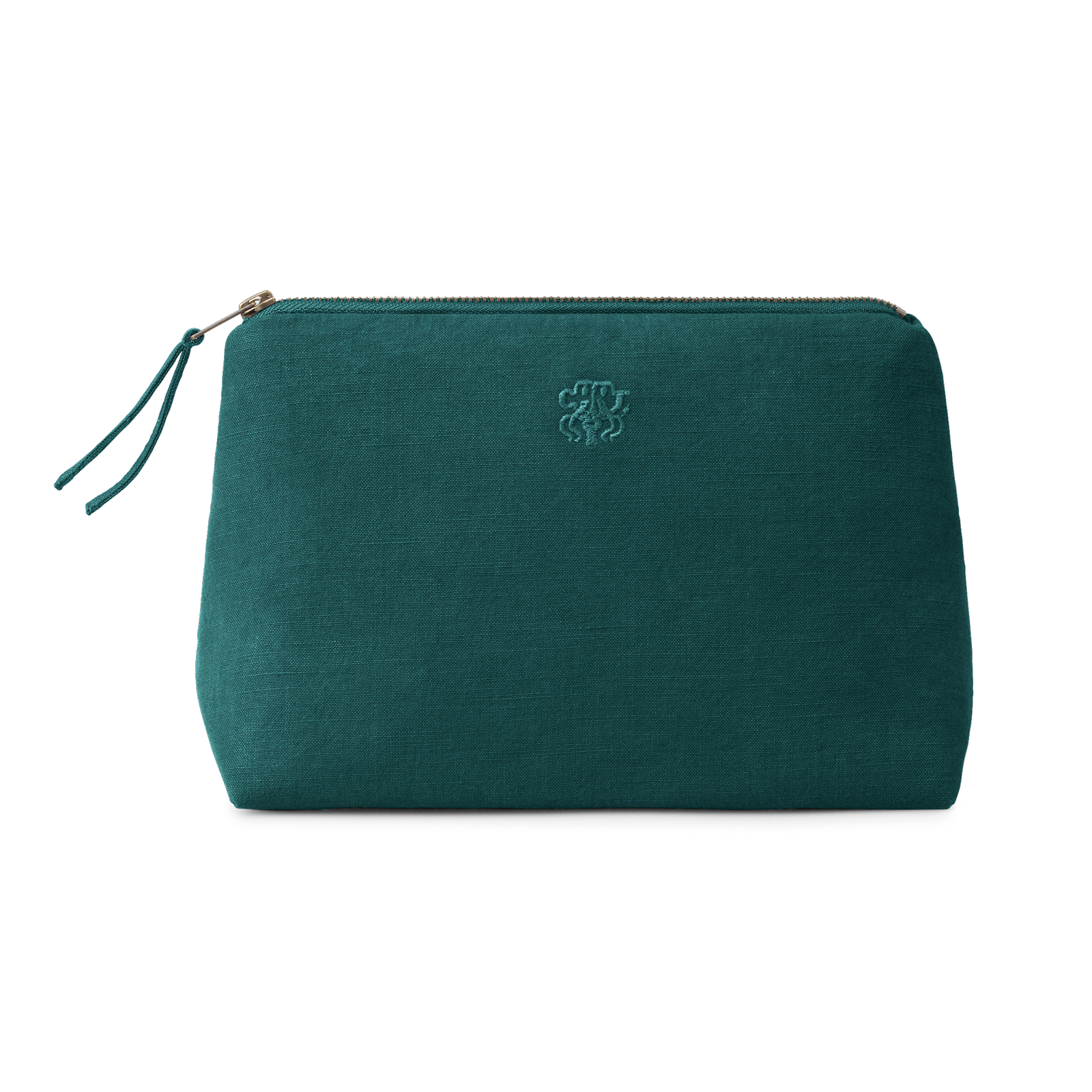 Funktionell och rymlig necessär i en tidlös design. All-necessären är vävd i 100 % bomull med en innerficka och har Georg Jensen Damasks logotyp broderad som en elegant detalj. Färgen Evergreen är en mörk, kall grön – klassisk och sofistikerad.