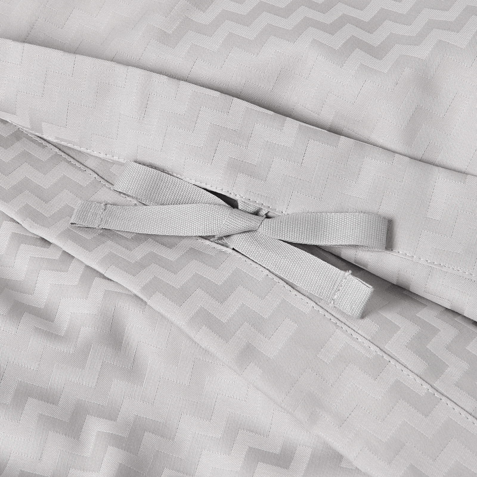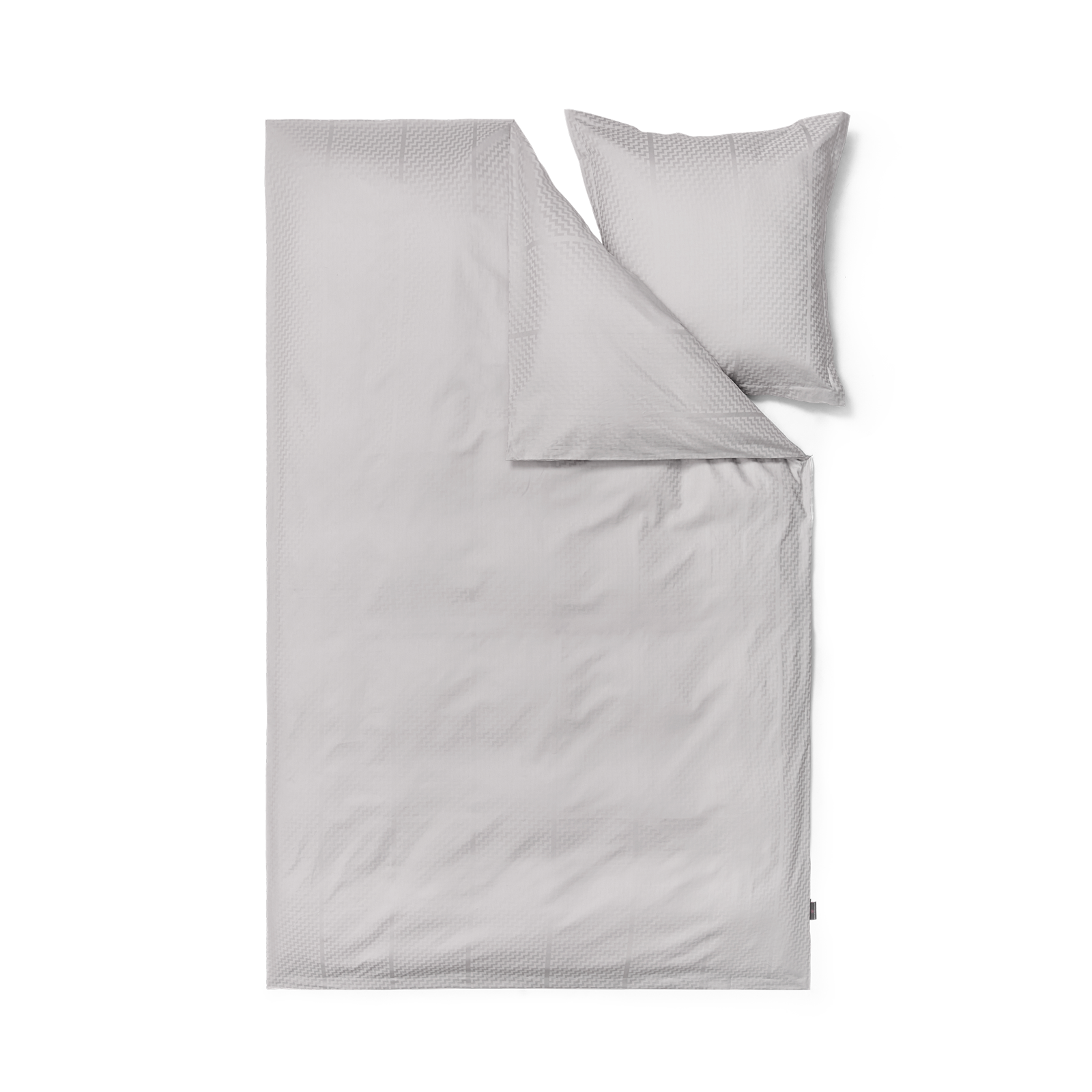 Det geometriska mönstret i Tripp-designen är utformat som en trappa, som upprepas och endast bryts av en vertikal linje. Det skapar ett enkelt och harmoniskt utseende. Sängklädernas mönster framhävs vackert i damastväven och förstärks ytterligare av den eleganta ljusgrå färgen Silver Cloud.