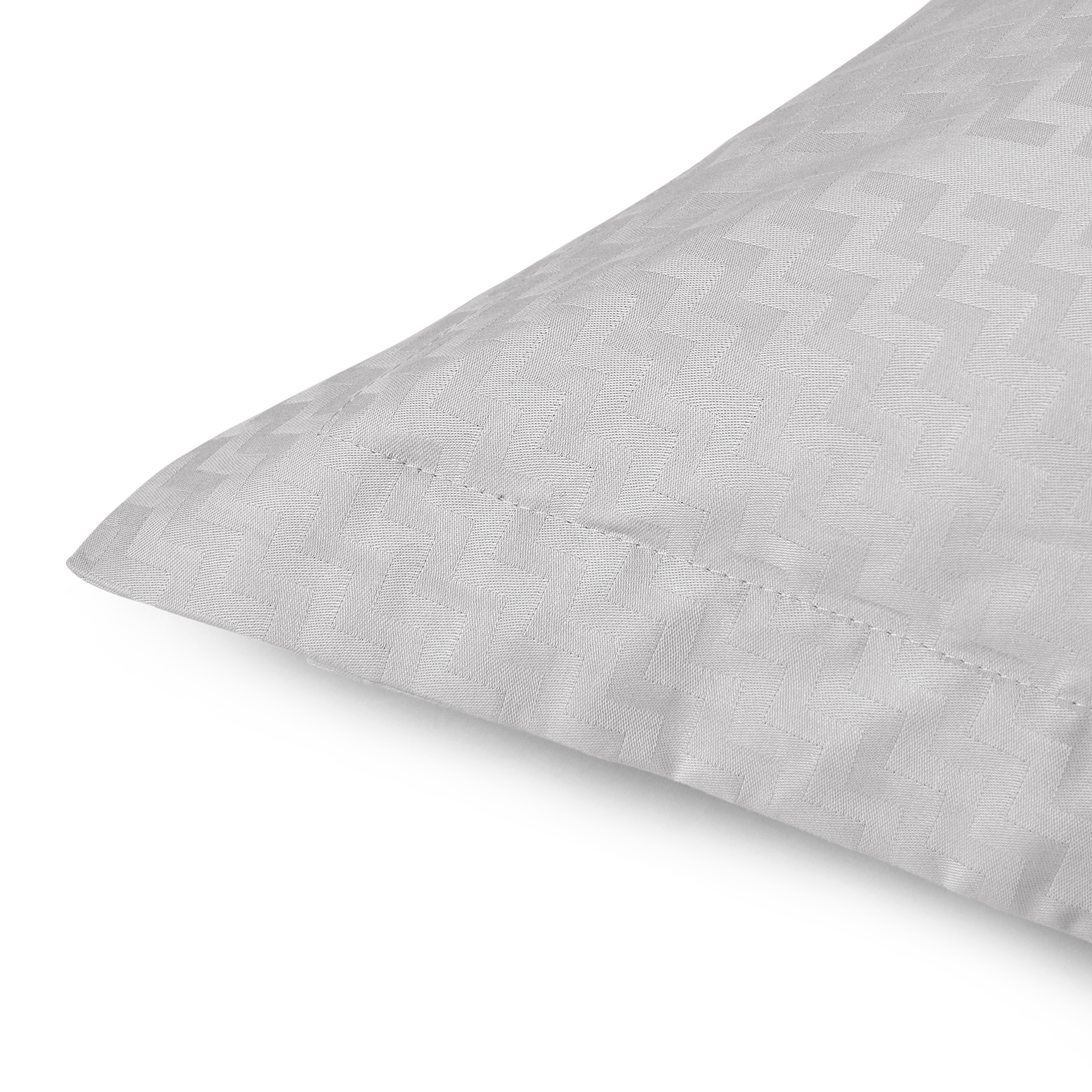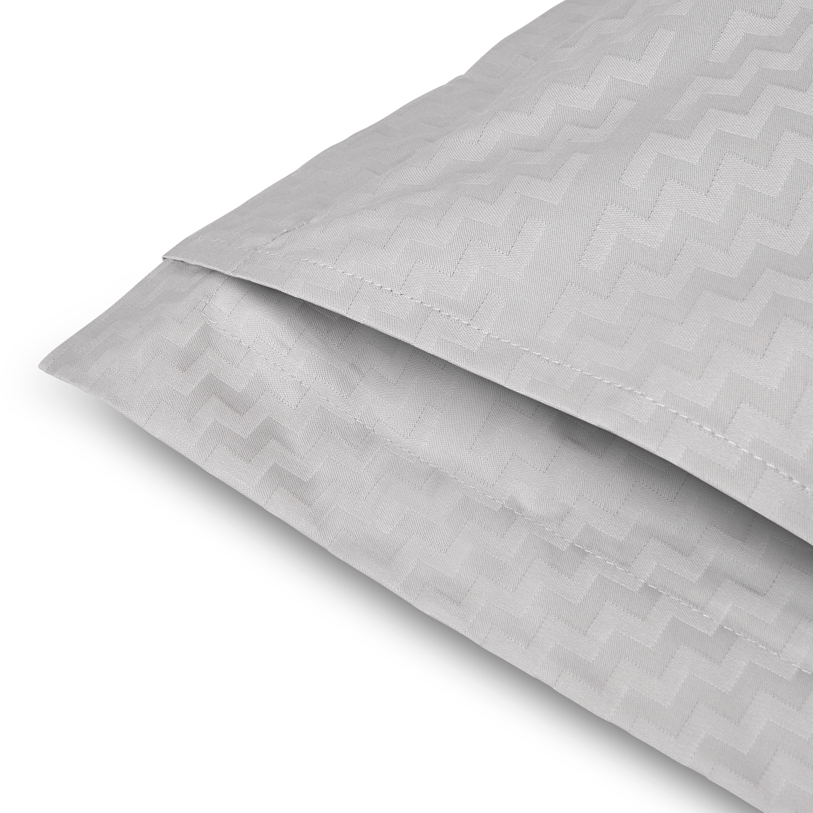 Det geometriska mönstret i Tripp-designen är utformat som en trappa, som upprepas och endast bryts av en vertikal linje. Det skapar ett enkelt och harmoniskt utseende. Mönstret på örngottet framträder vackert i damastväven och förstärks ytterligare av den eleganta ljusgrå färgen Silver Cloud.