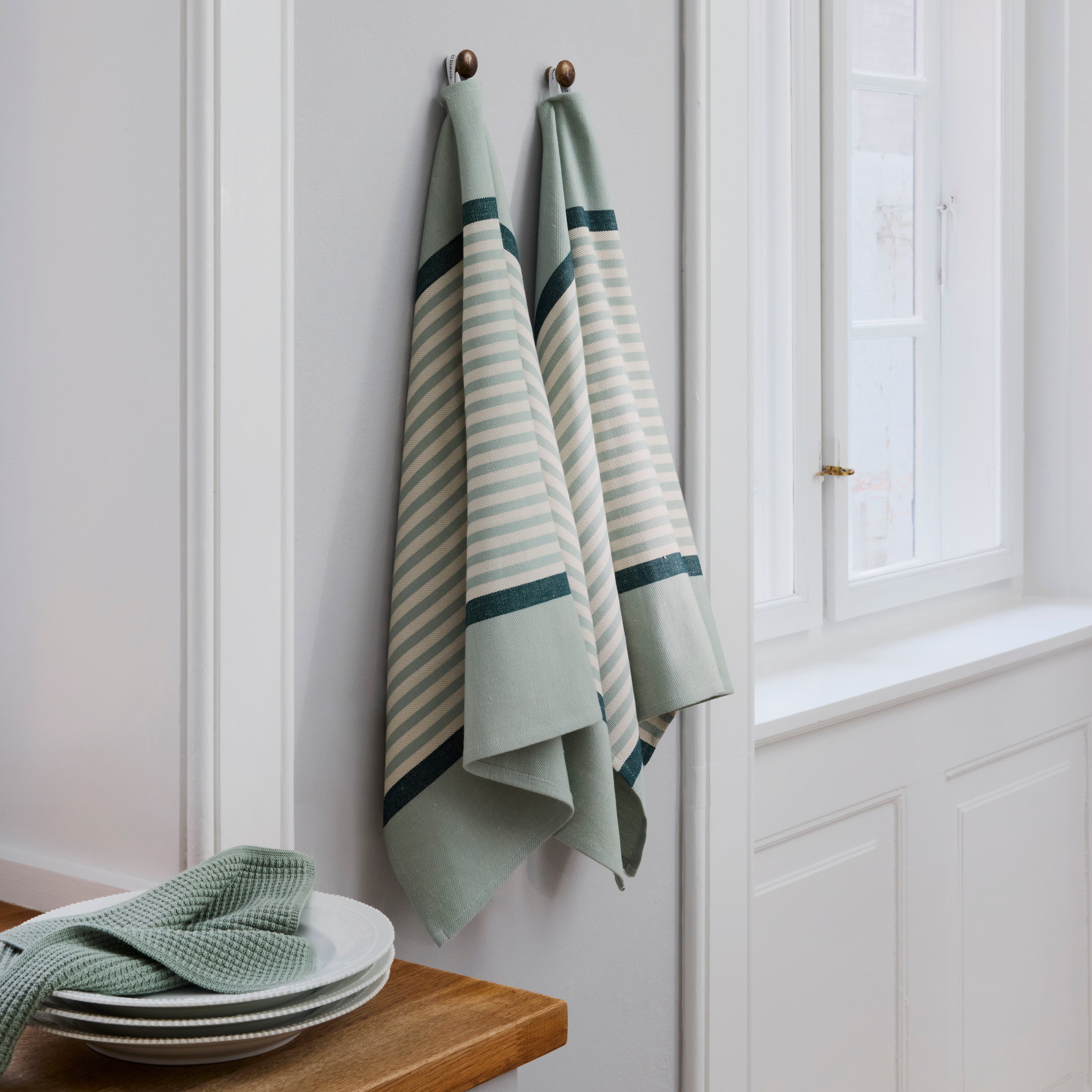 Abild är en klassiker i Georg Jensen Damasks kollektion och firar i år 35‑årsjubileum. Den ikoniska designen är vävd i en kombination av 50 % lin och 50 % bomull, och det strama uttrycket är vackert både för sig själv och tillsammans med andra diskhanddukar och kökstextilier. Färgkombinationen Silver Sage är en särskild, limiterad jubileumsvariant och består av gröna ränder i olika nyanser på en ljus, beige bakgrund.