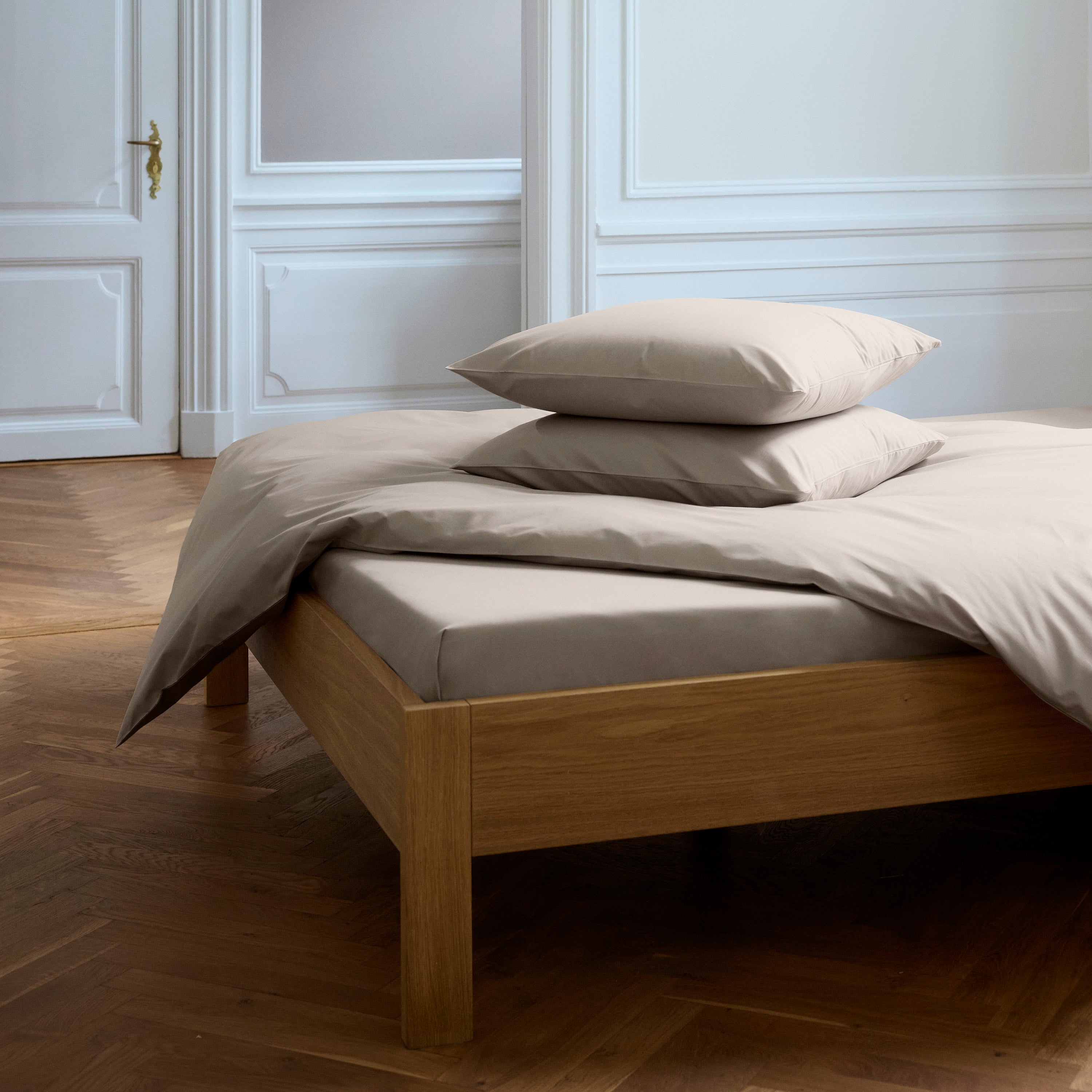 Supima Percale-sortimentet omfattar allt från sänggavlar och kuddar till Duntäcke och lakan i färger som ljusgrått, ljusgrönt, svalt blått och varma jordtoner. De långa bomullsfibrerna ger sängkläderna en särskilt vacker och mycket enhetlig färgton.